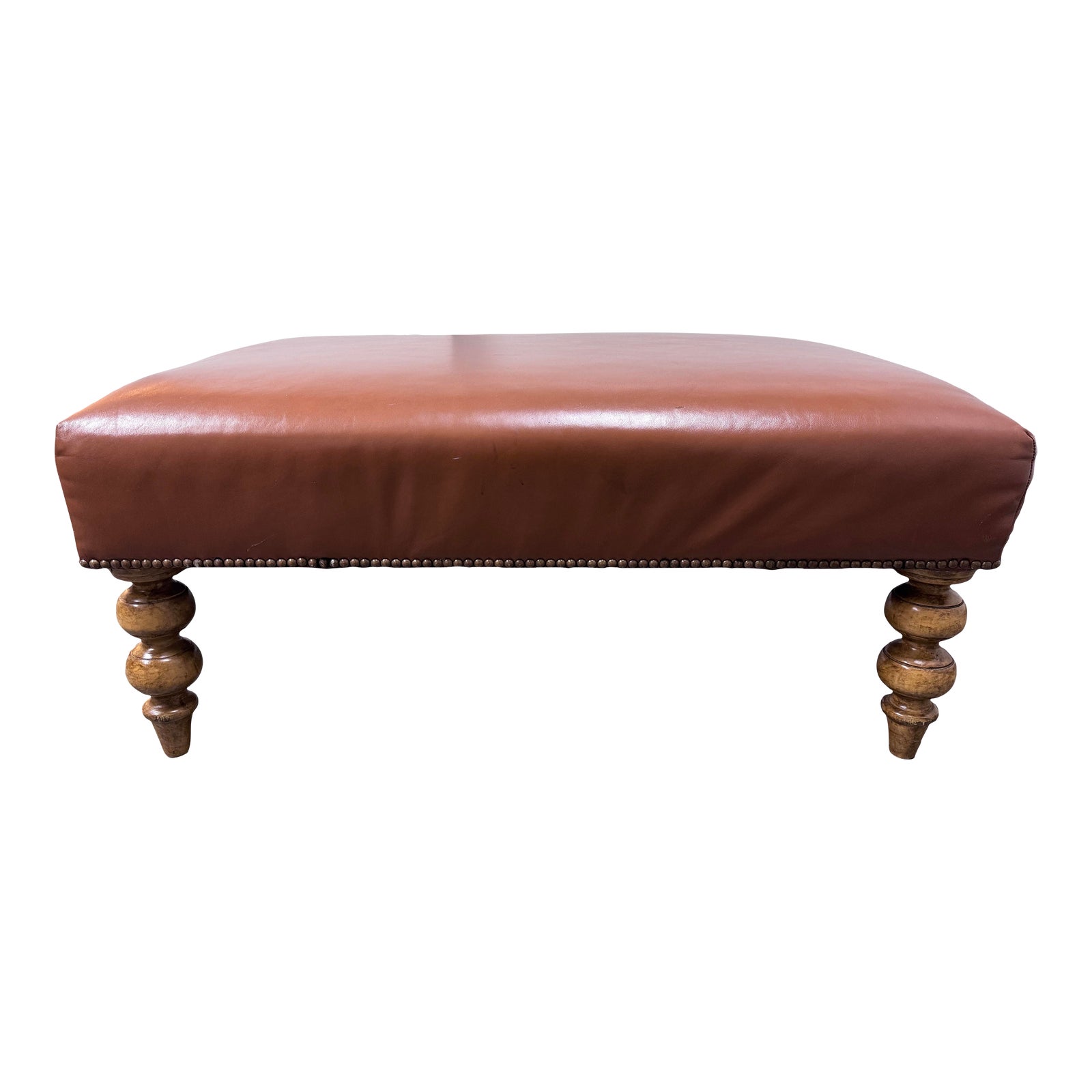 Brown Leather Ottoman + Turned Legs + Nailhead Trim