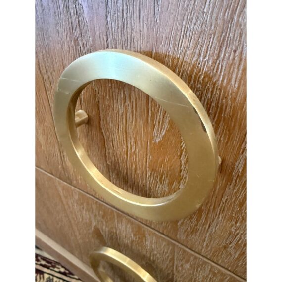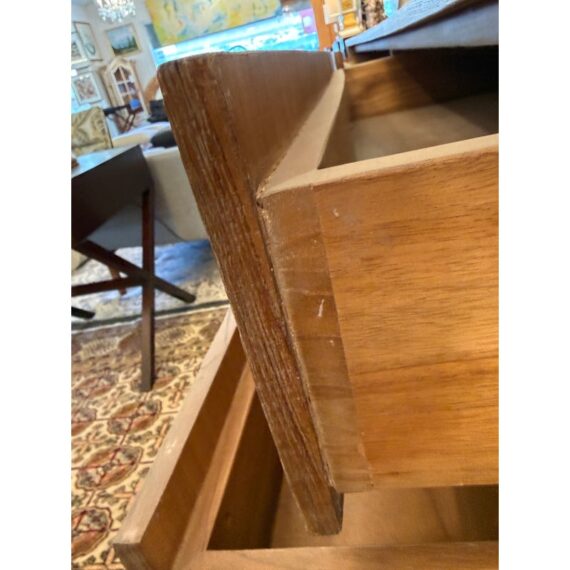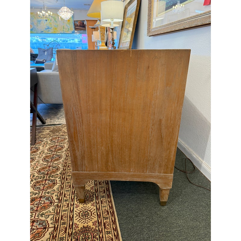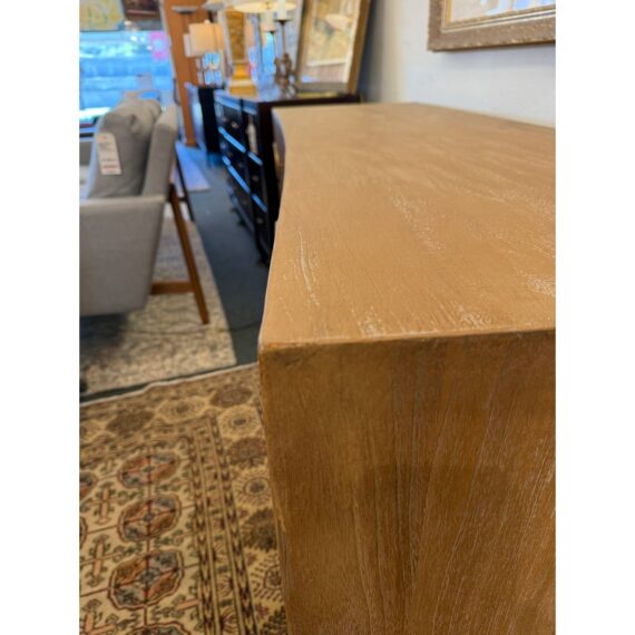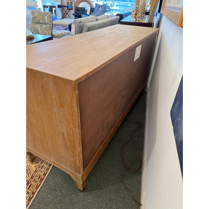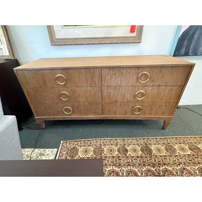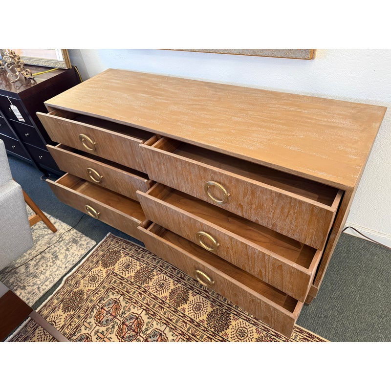 Design Plus Gallery presents an Atherton Cerused Teak Dresser in Beach Finish by Brownstone Furniture. The creator of the dresser has undoubtedly employed a meticulous approach to harmonizing sophisticated design with the finest materials. Crafted from teak that has been lightly cerused and adorned with opulent solid brass accents, this dresser exudes graceful curves that epitomize subtle elegance. Light surface wear; condition is good for age and use.