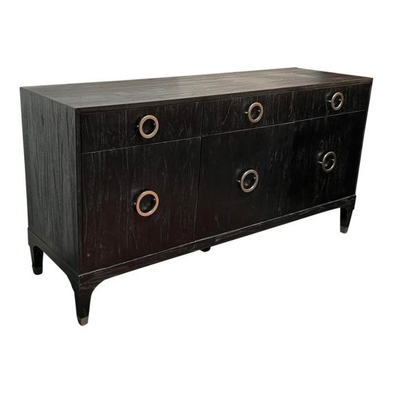 Design Plus Gallery presents the Atherton Sideboard by Brownstone. The Atherton cabinet embraces elegant style with richly gained surfaces and brushed stainless steel hardware. Finished in a deep onyx, this sideboard offers three shallow drawers and a trio of wide doors that open to reveal adjustable/removable shelves. The Atherton cabinet is elevated on tapered wood legs with stainless ferrules. Little evidence of wear; overall good condition.