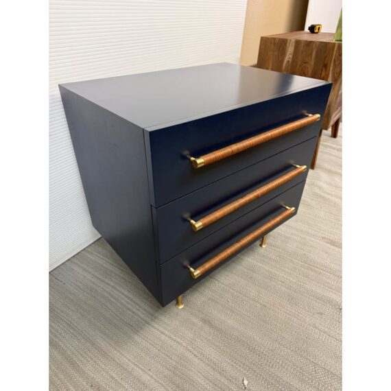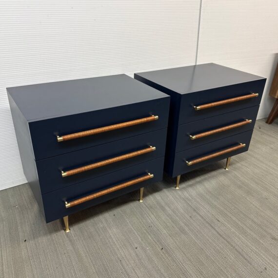 Design Plus Gallery presents a Pair of Audrey Navy 3-Drawer Nightstands from Brownstone Furniture. Stylish options for bedside nightstands in matte navy blue. Each is designed with a boxy frame, distinctive tapered brass legs, and natural rattan-wrapped + brass pulls on each of its three roomy soft-close drawers. Light wear; condition is good.