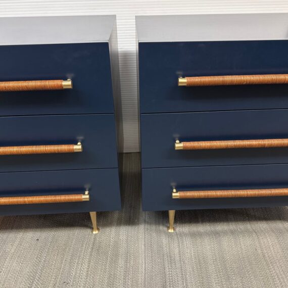 NEW Brownstone Audrey Rattan Handle Navy Night Stands, Pair. Original Price: $3,570
