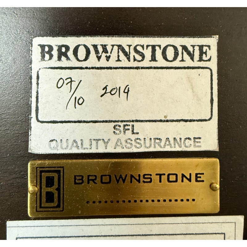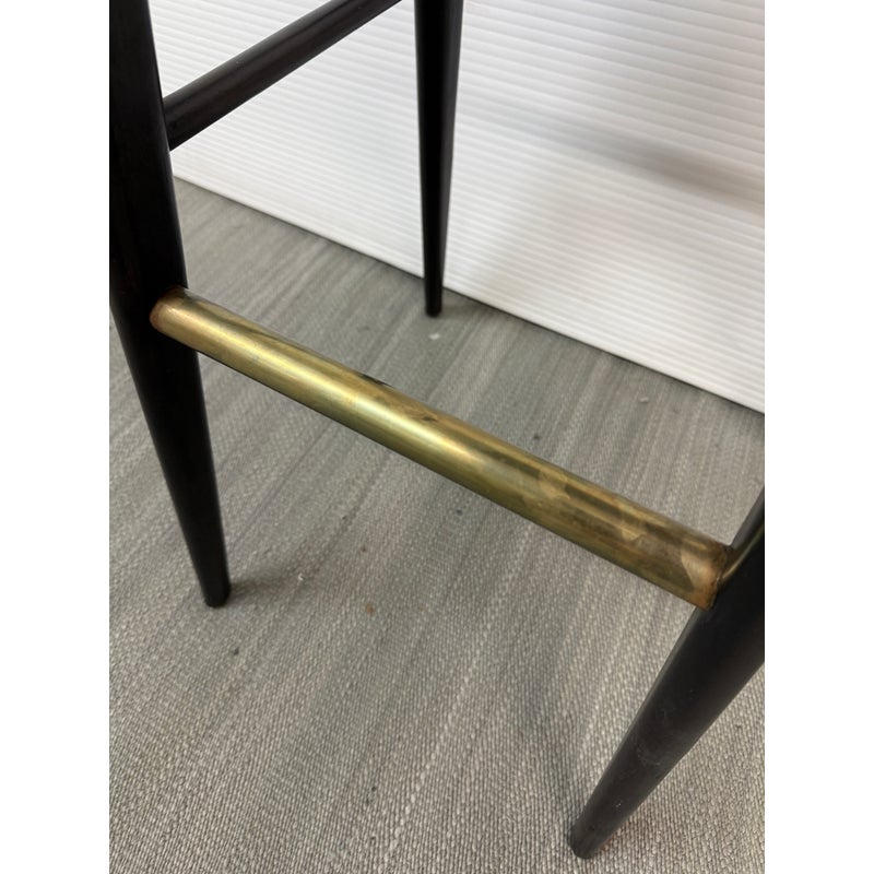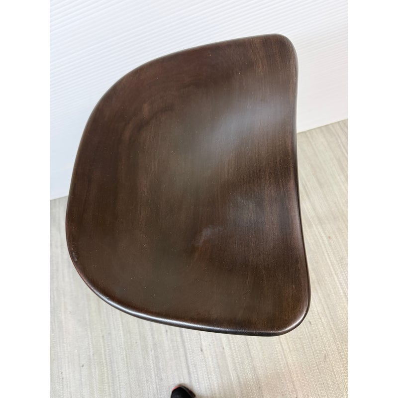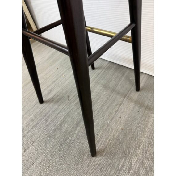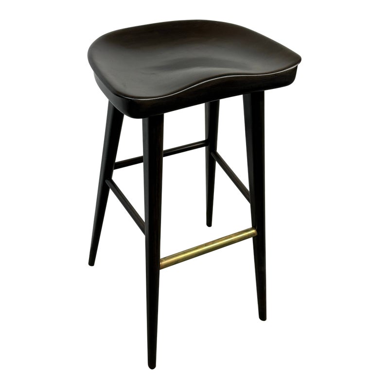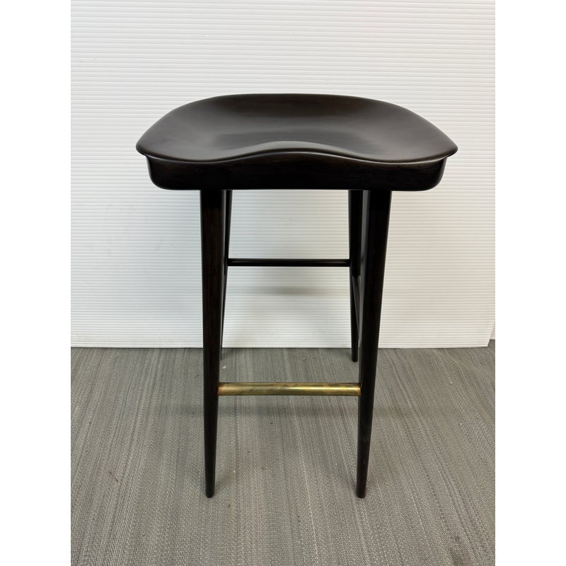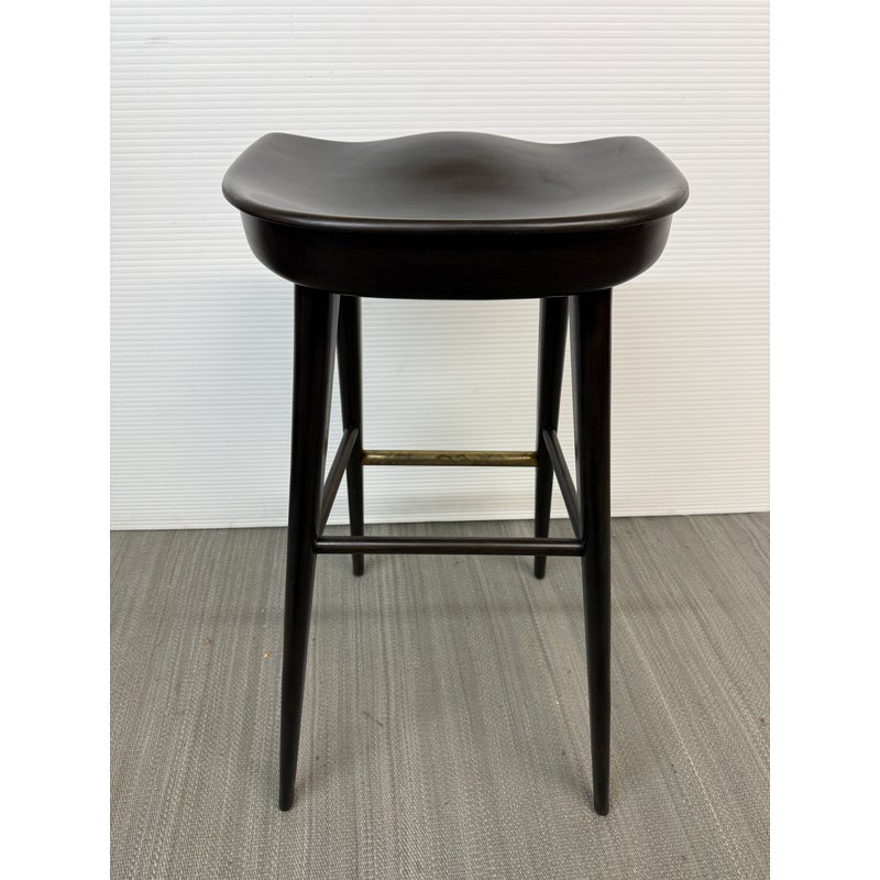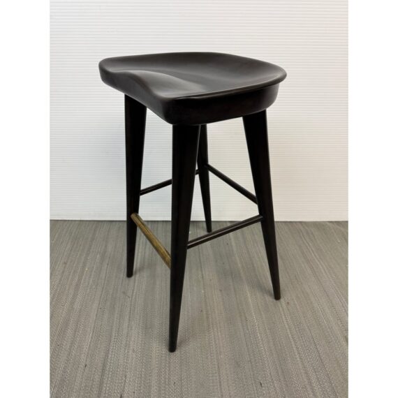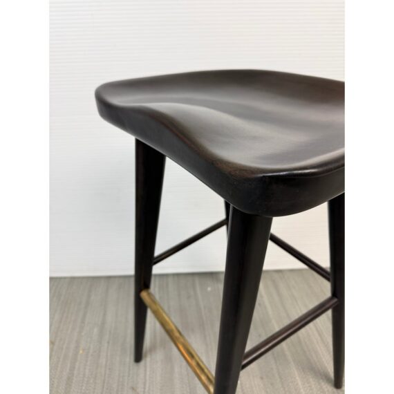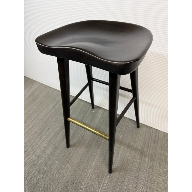 Design Plus Gallery presents a Balboa Bar Stool from Brownstone Furniture. The stool has a driftwood finish over solid teak wood. The dark tone of espresso stain has brass plate kick bar in the front and exposed wood stretchers on the remaining legs. The contoured seat will be comfortable even when sitting for extended periods. It is in good condition with minimal wear for its usage.