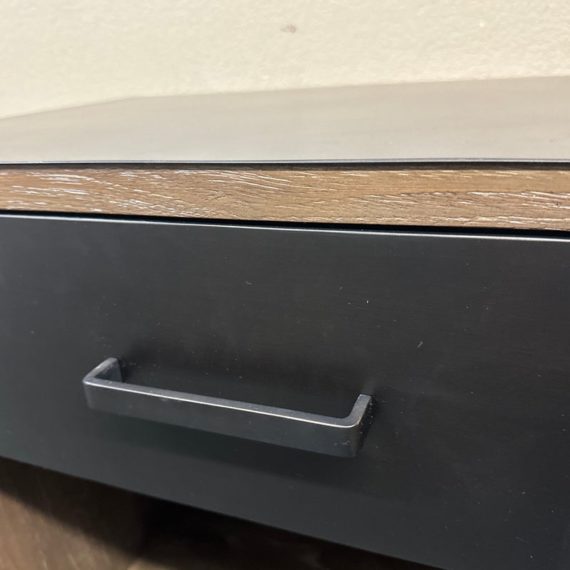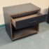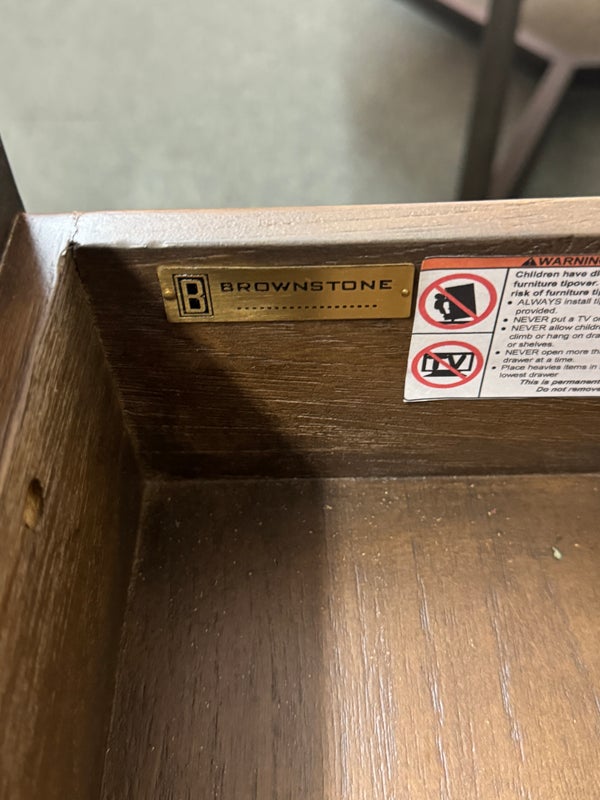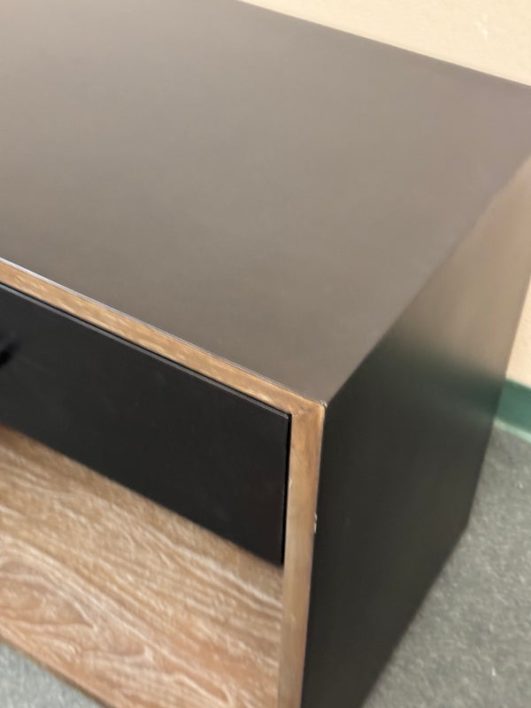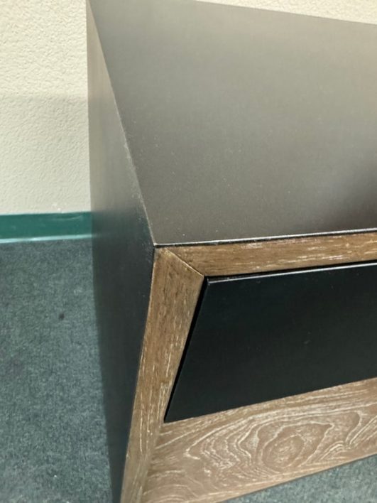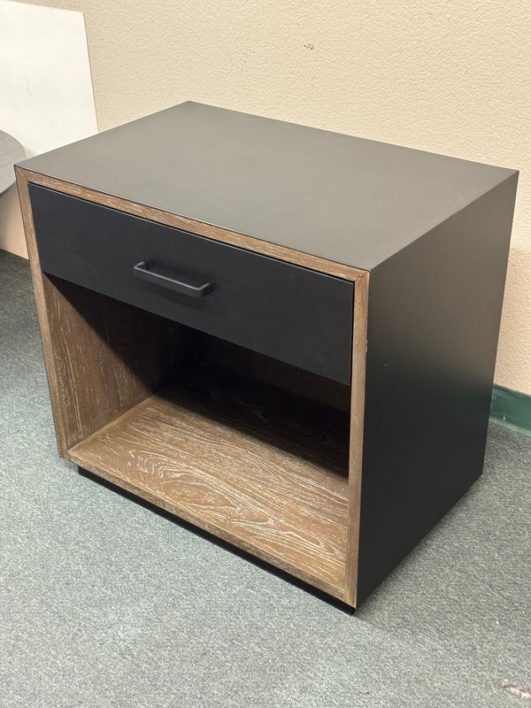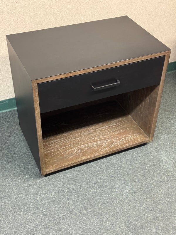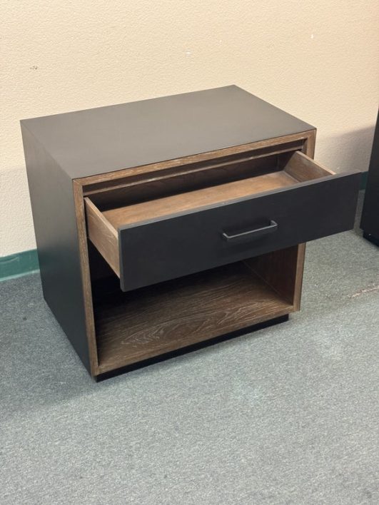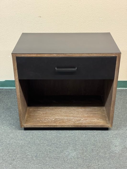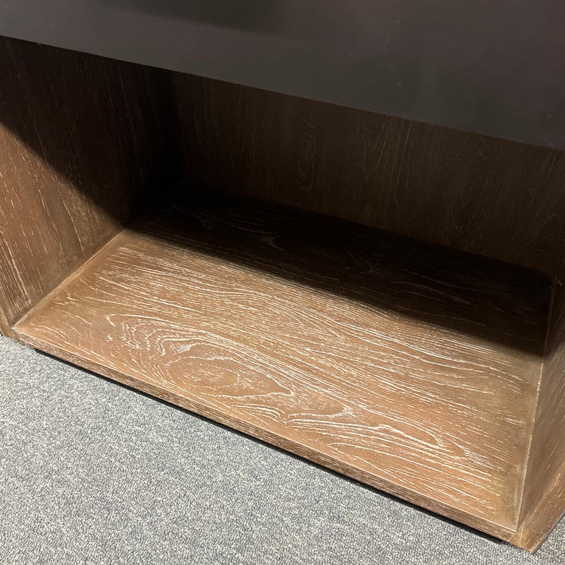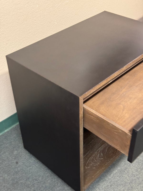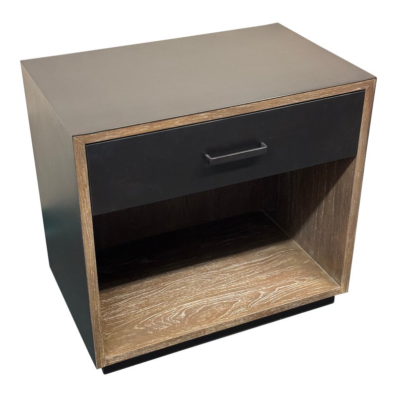 Design Plus Gallery presents the Baldwin Nightstand by Brownstone. The single drawer nightstand seamlessly combines the sophistication of bronze metal cladding and richly grained sand blasted teak, to create a design that is elegant in its simplicity and durable in function. Softclose drawer above spacious cubby for storage or display. Little surface wear; showroom condition.