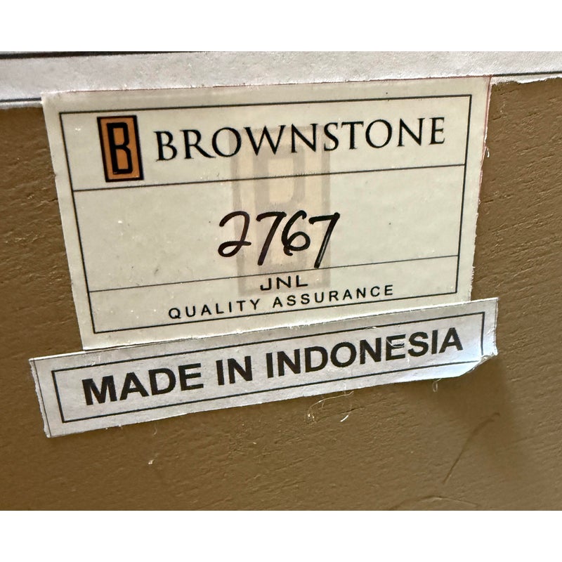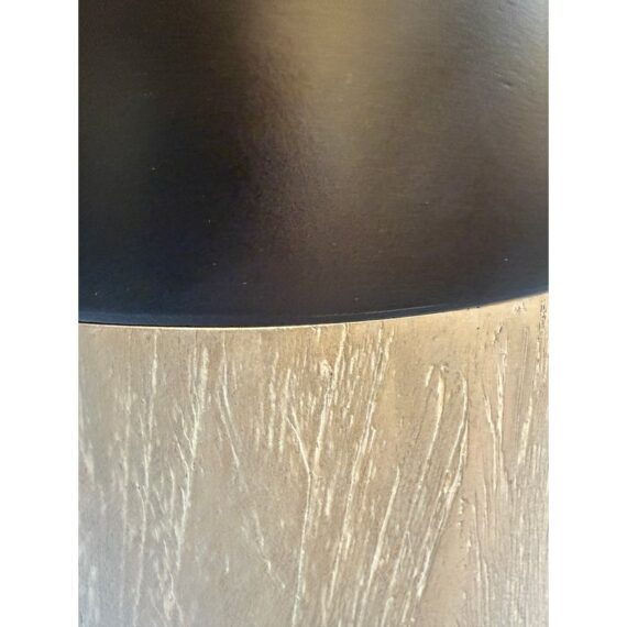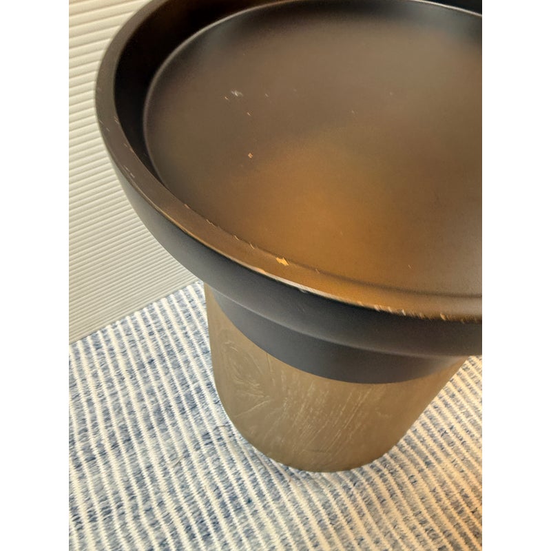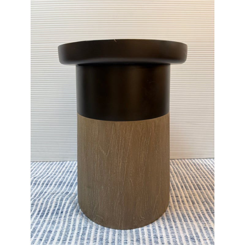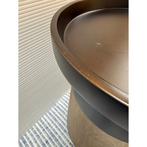 Design Plus Gallery presents the Brady Side Table by Brownstone Furniture. This versatile side table seamlessly integrates into any space, providing both style and functionality. Its minimalist design and practical features make it an aesthetically pleasing addition to any room. The table’s metal top is finished in a rich bronze hue, complemented by the Fog-finished teak base. Light surface wear is consistent with age and use. Made in Indonesia.