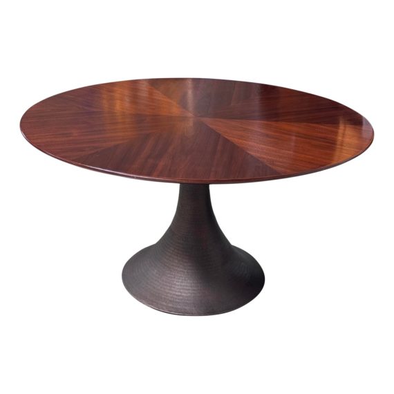 Design Plus Gallery presents a Casablanca Walnut + Bronze Dining Table by Brownstone. This striking table is the perfect balance of handmade craftsmanship with contemporary styling. The table top is a rich, warm walnut. The base is a hand-hammered bronze finished pedestal in a classic trumpet form. There is minor wear on surface and a dent on the base. Visible and minor wear. In good condition.