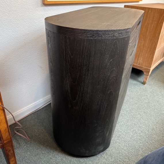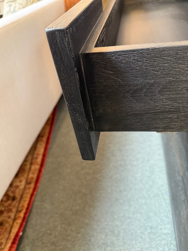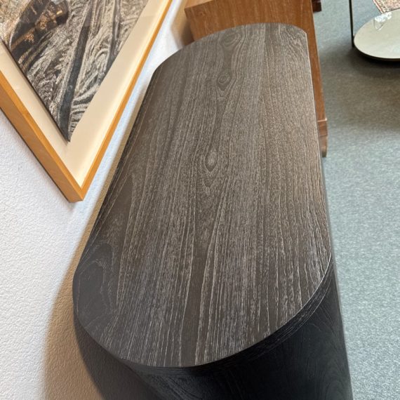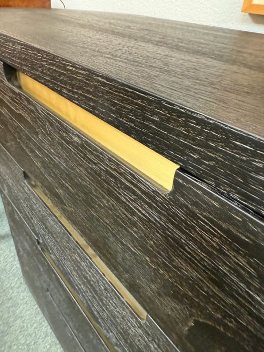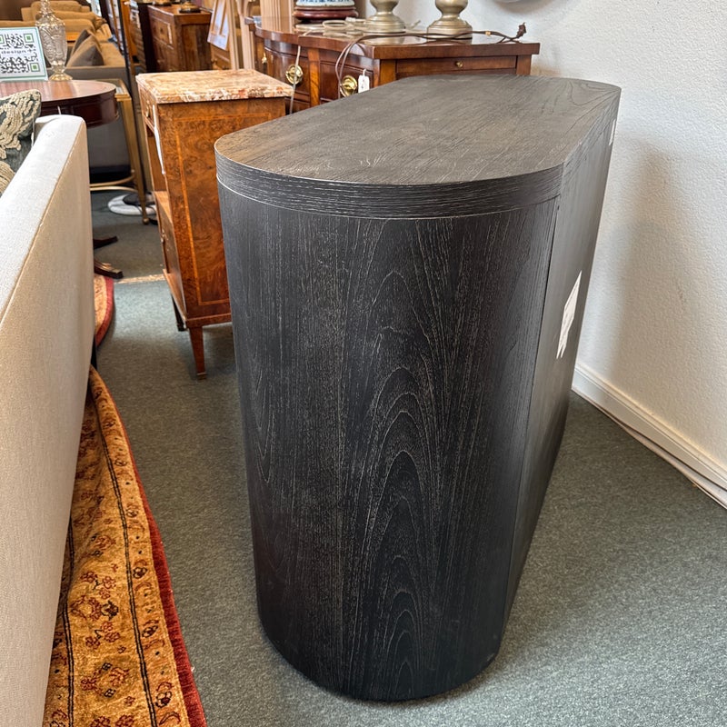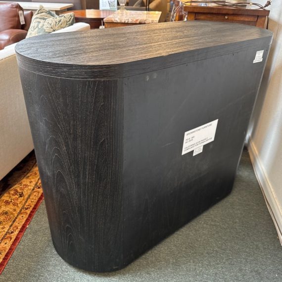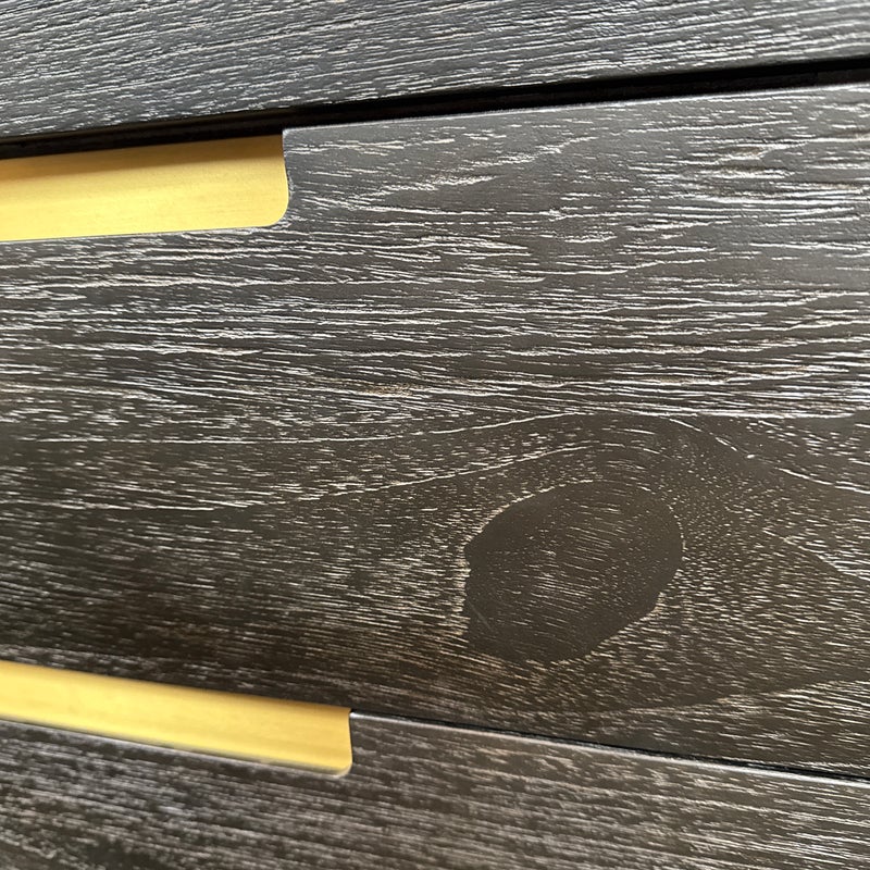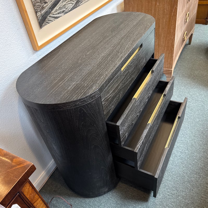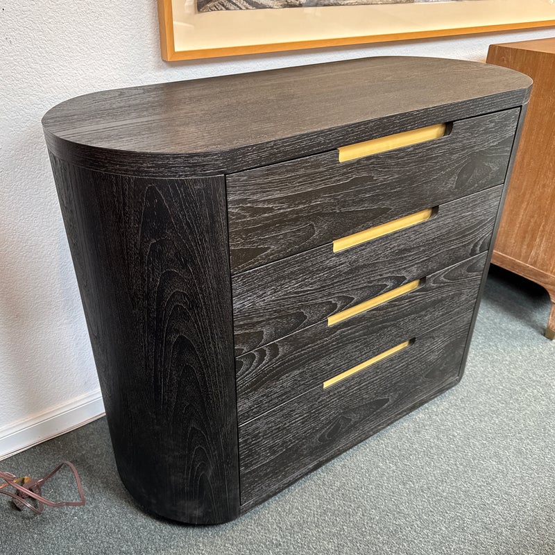 Design Plus Gallery presents a Palmer Oval Bachelor Chest from Brownstone Furniture. The richly grained teak with a sandblasted, mink finish is juxtaposed with bright brushed brass hardware. Soft Close mechanism on four roomy drawers. Little wear; good condition. Made in Indonesia