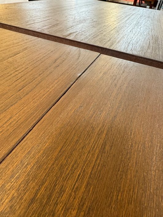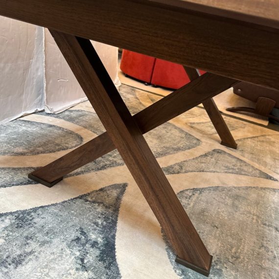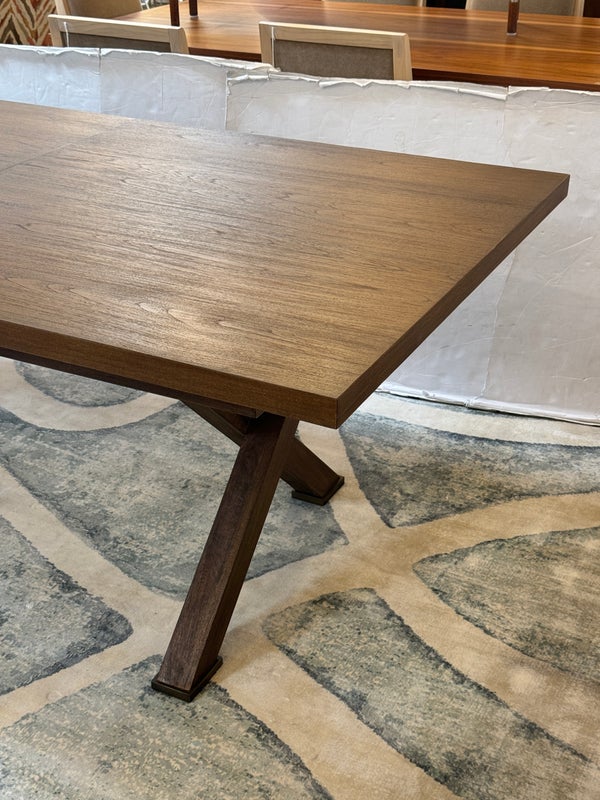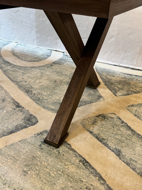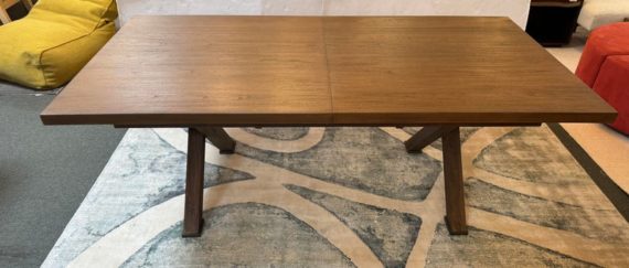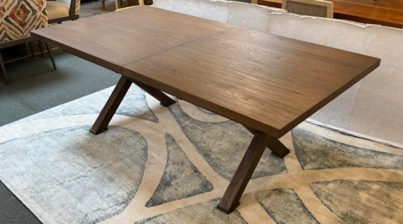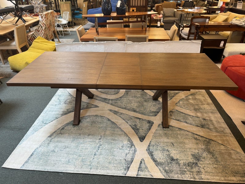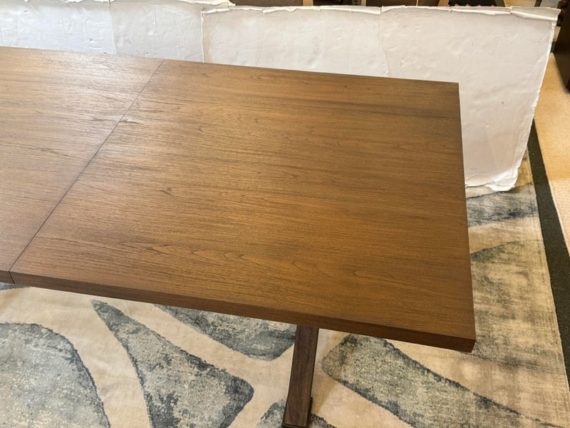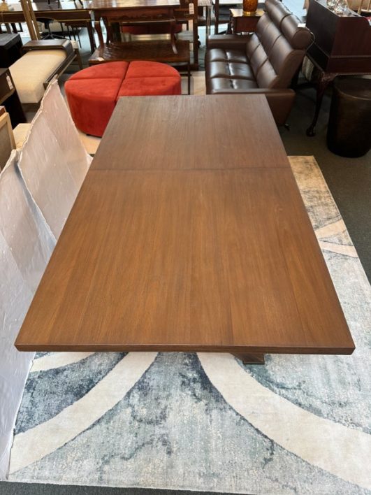 Design Plus Gallery presents the Laguna Dining Table by Brownstone. Giving way to a communal feeling, the Laguna’s form and functionality inspires gathering. The double pedestal teak table is always ready for extra guests with its self-storing extension. Bronze footings enhance this well-designed table. Light surface wear; condition is good for age and use.