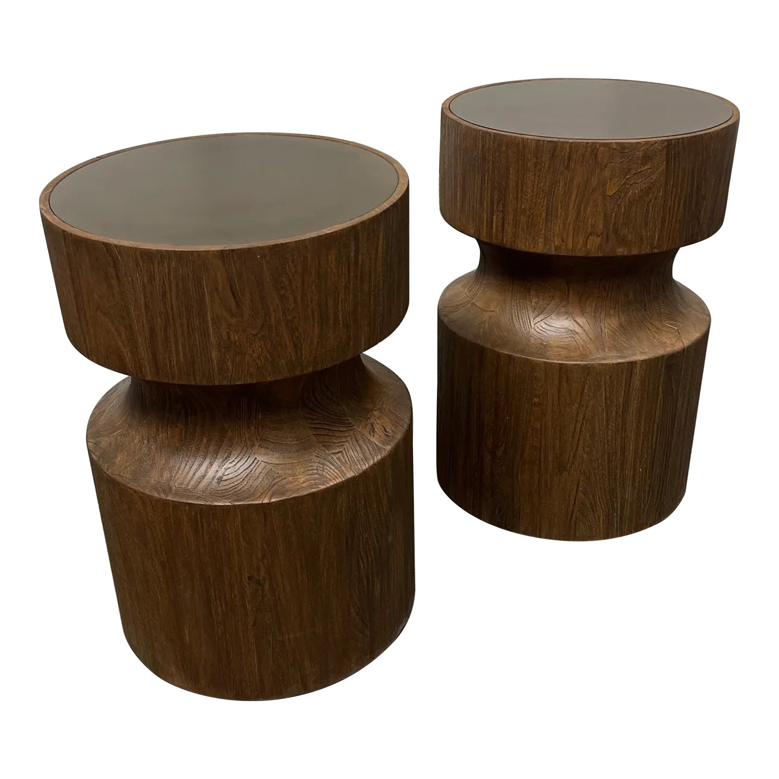 NEW Brownstone Laguna Drum Solid Teak Side Tables, a Pair. Original Price: $3,756