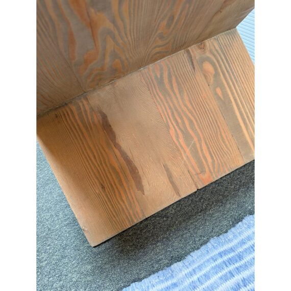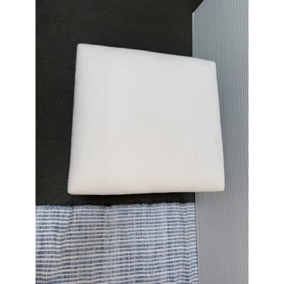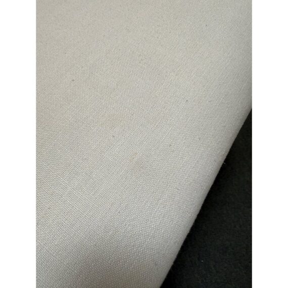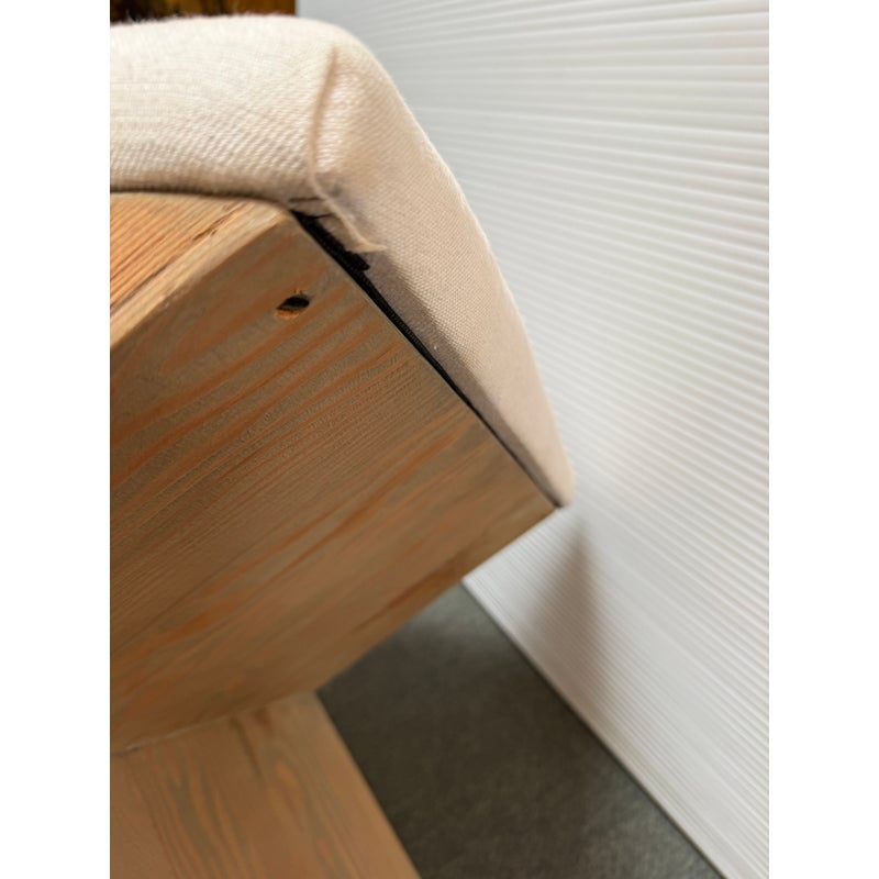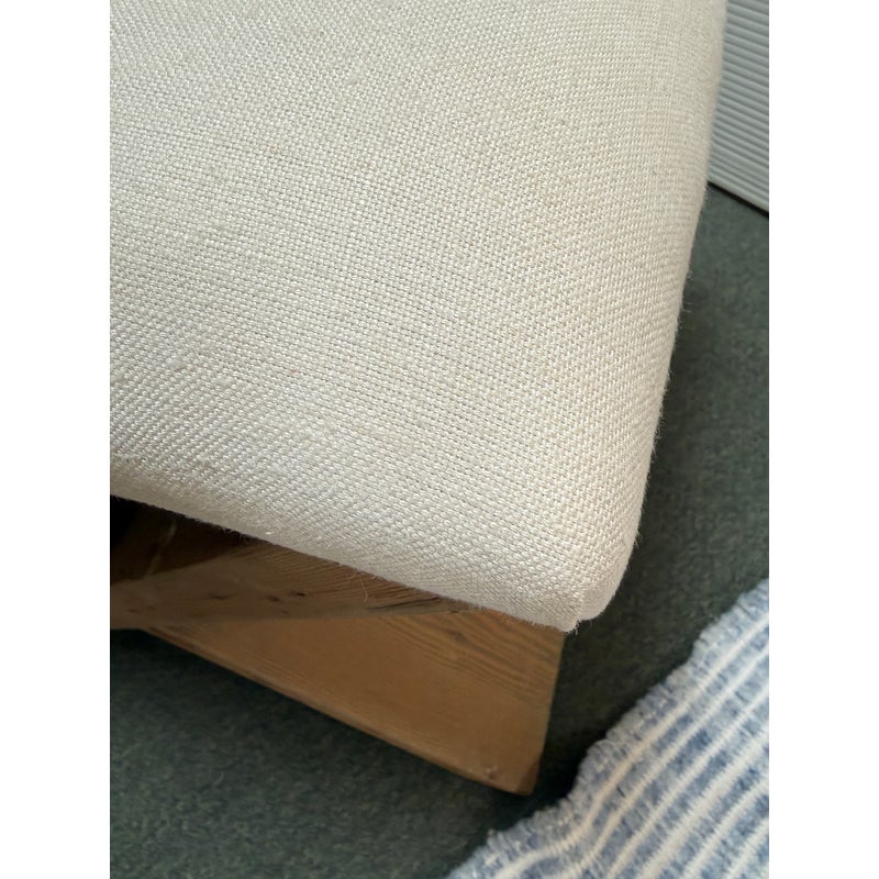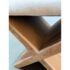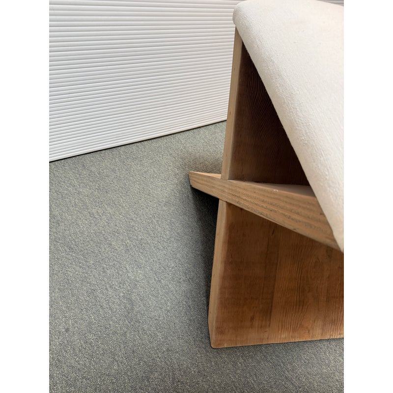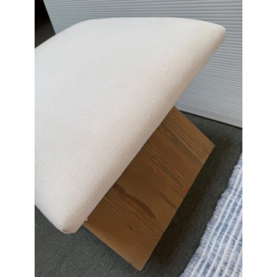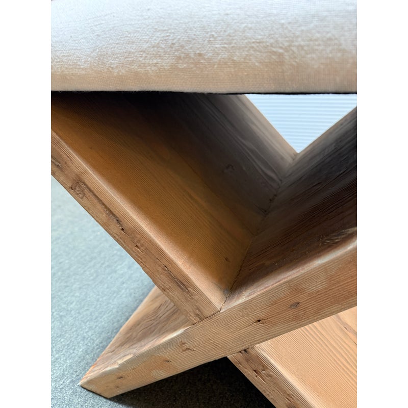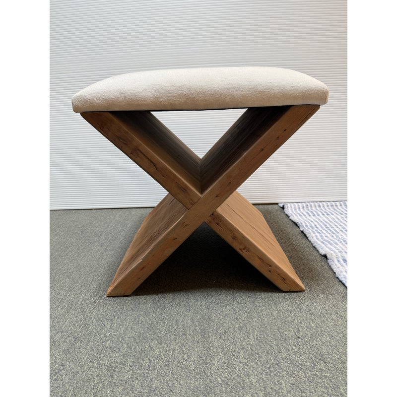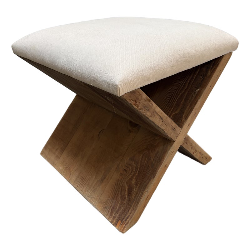 Design Plus Gallery presents a X Base Stool by Brownstone Furniture. Rustic wood base with a light washed finish, is shaped in an iconic silhouette that contrasts the smooth linen cushioned seat. Visible surface wear; condition is consistent with age and use.