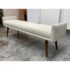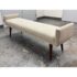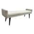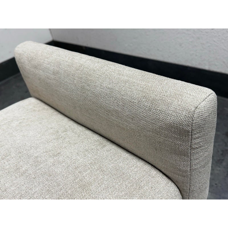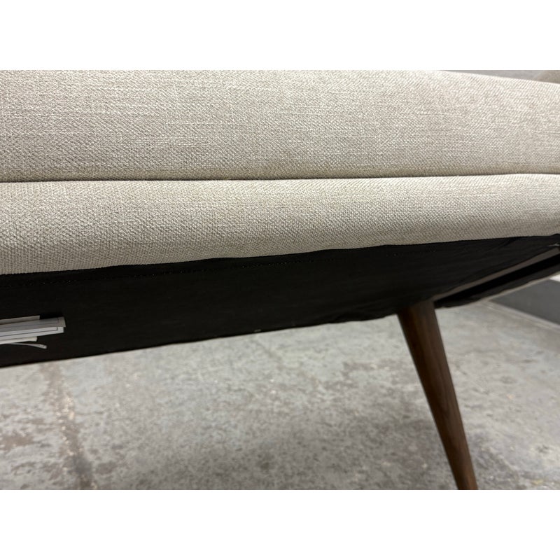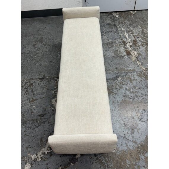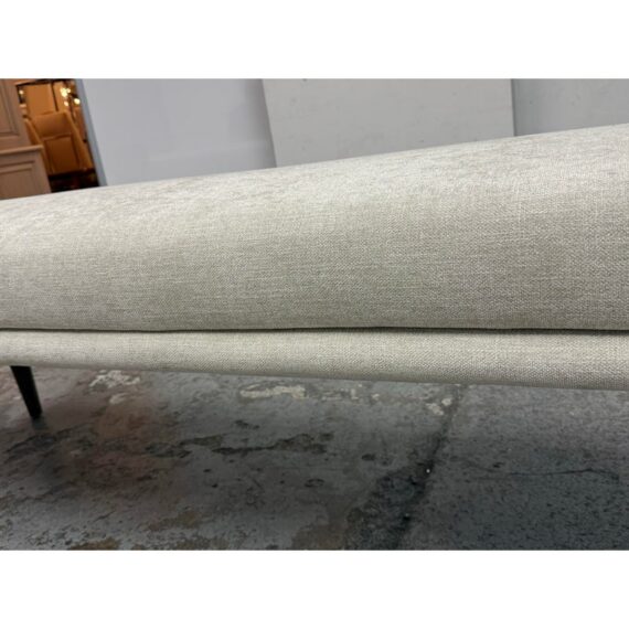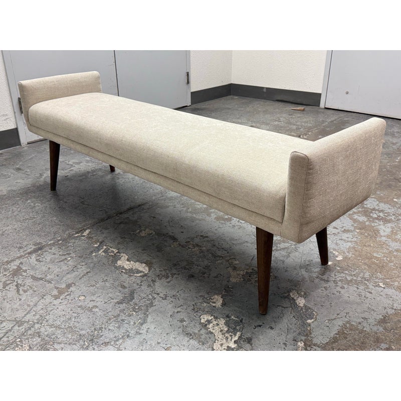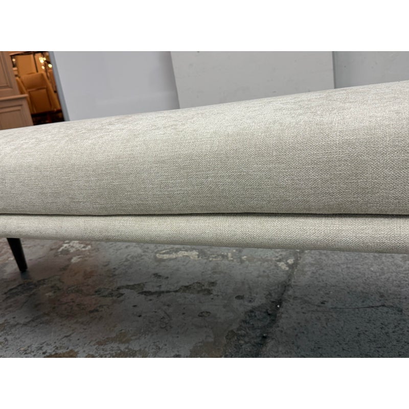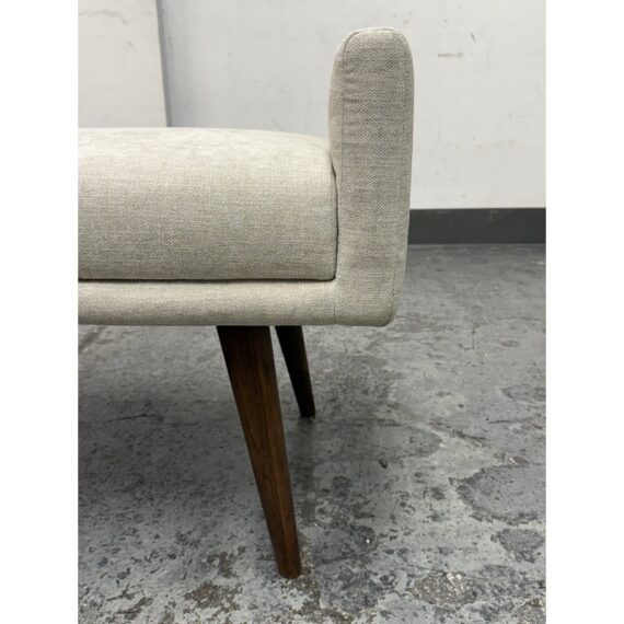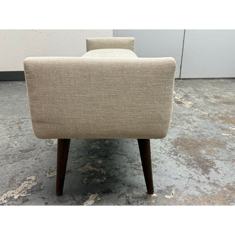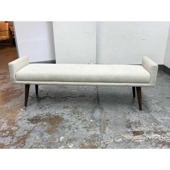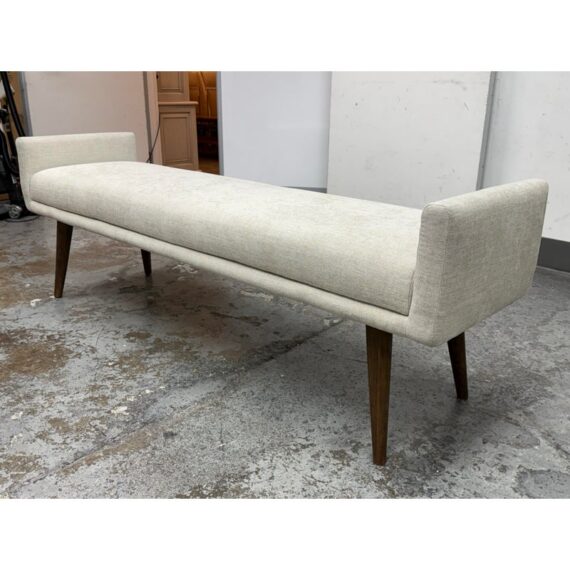 Design Plus Gallery presents the Remy Bench from Brownstone Furniture. This upholstered bench has a long, tailored profile with upholstered end panels and tapered wood legs. The seat is covered in a light neutral woven fabric with a restrained texture, and the silhouette balances straight lines with softly rounded edges. The overall look is streamlined and understated, with a substantial seat and supportive end panels that define the form. This is a discontinued model with the brand and is in good condition with visible and minimal wear from usage. Made in Indonesia.