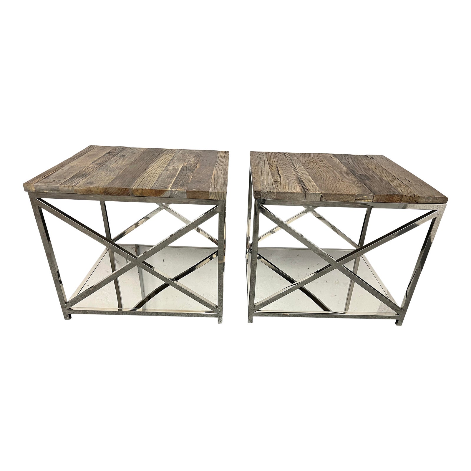 Design Plus Gallery presents a Pair of Sonoma End Tables by Brownstone. A combination of the natural beauty of reclaimed elm with refined, polished stainless bases to create a Modern Industrial. The contrast is striking, while the result is exquisite. Visible aging of the reclaimed wood.