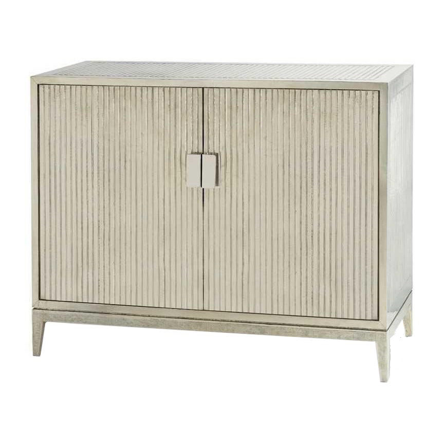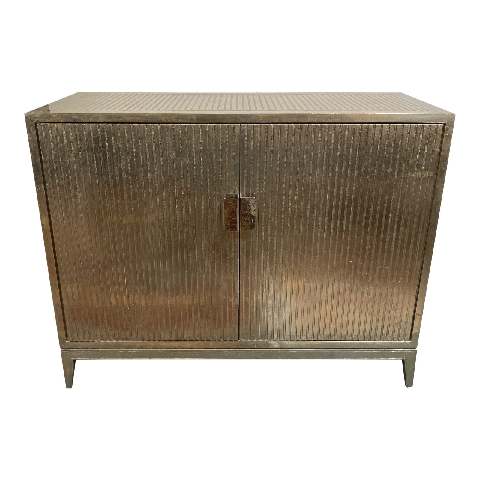 Design Plus Gallery presents a Brownstone Treviso German Silver Ribbed Cabinet. German silver, widely used in the 19th century, is a striking material that has been hammered in a ribbed and etched sculptural surface over the solid wood frame. Artfully applied by petite finishing nails. Interior is consists of an adjustable shelf with two small suede lined drawers (one missing bearings). Ideal as a bar cabinet or for any space in need of light from the subtle reflection of the silver. Serves as an elegant display and concealed storage piece of furniture as well. Minor wear. Silver finish has a slight warmth and reflects surroundings.