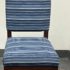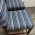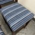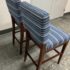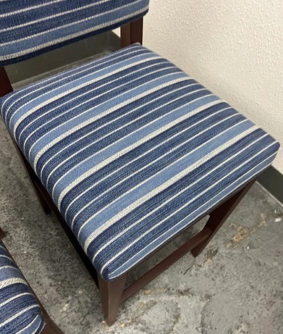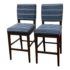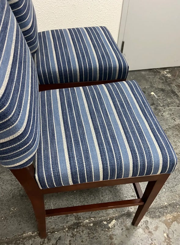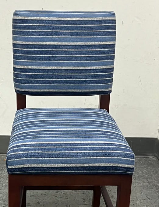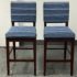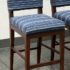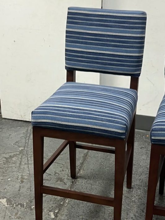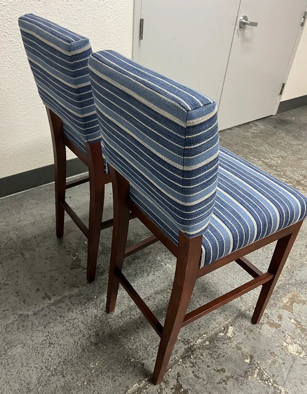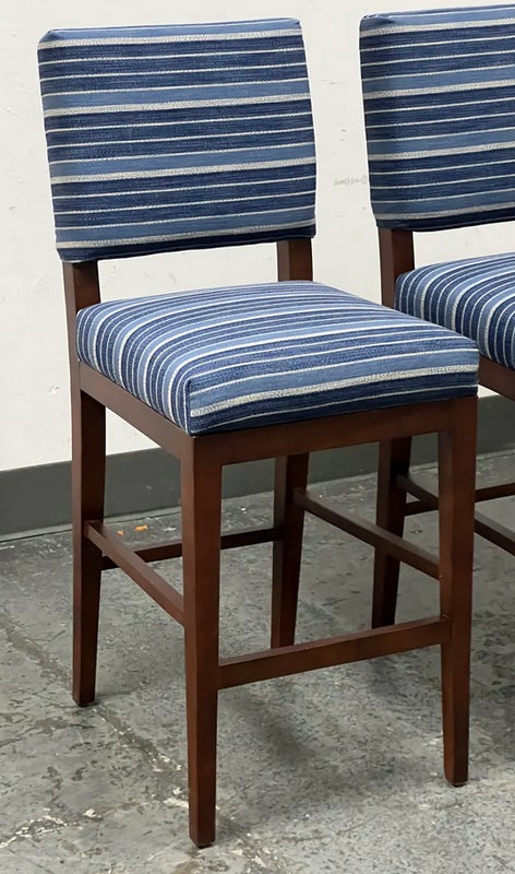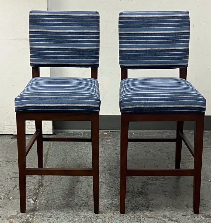 Design Plus Gallery presents a Pair of Cabo Bar Stools. The simple silhouette is crafted of praline stained teak. The blue and off-white stripe Performance upholstery wraps cushioned seat and back. Little evidence of wear; condition is good for age and use. Made in Indonesia.
