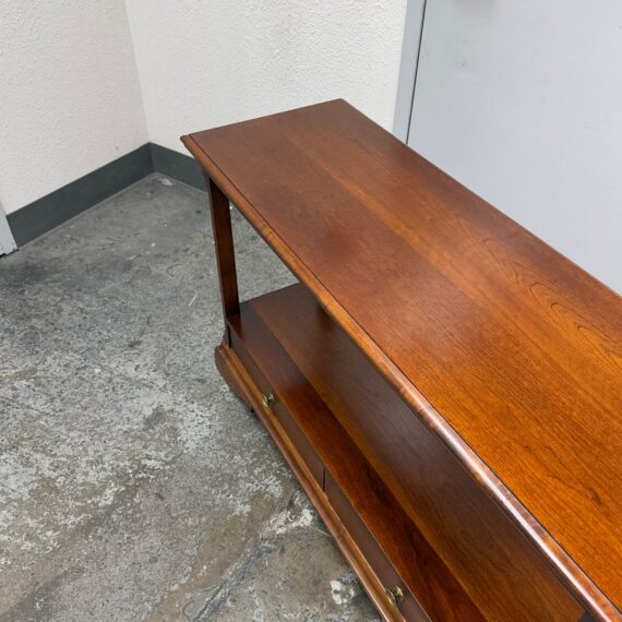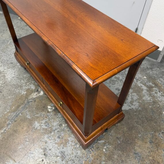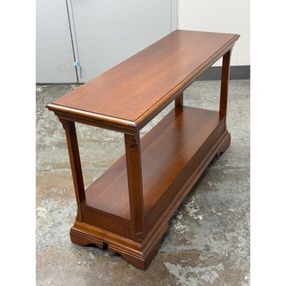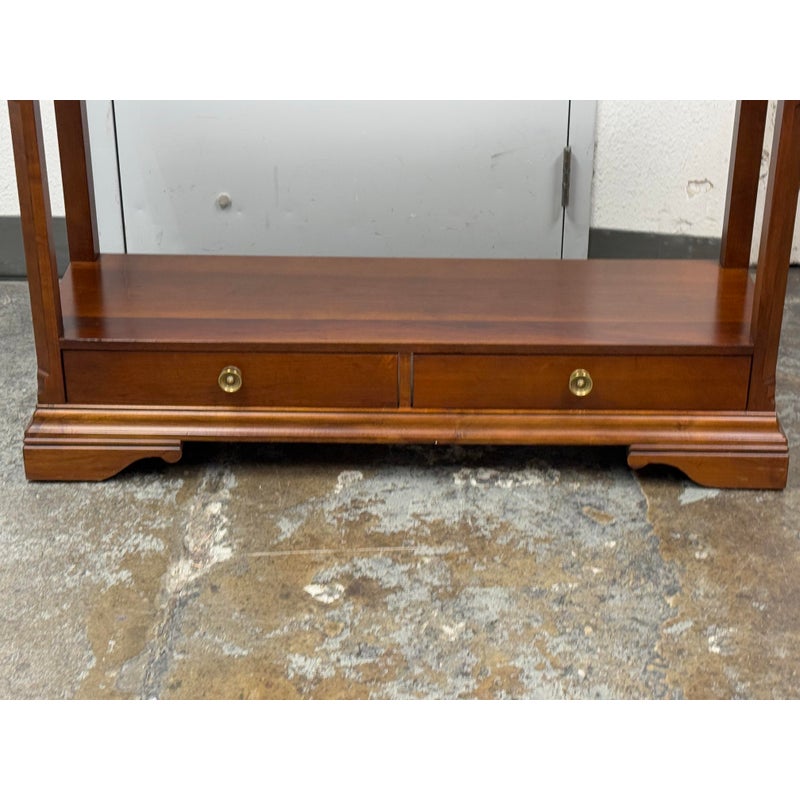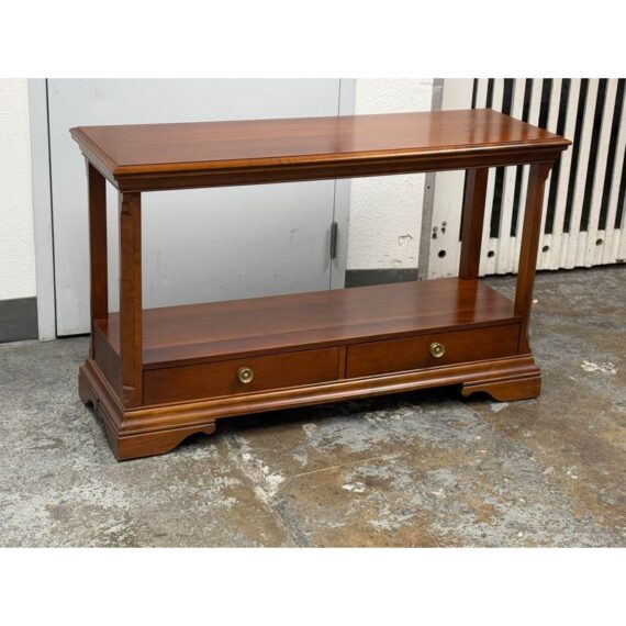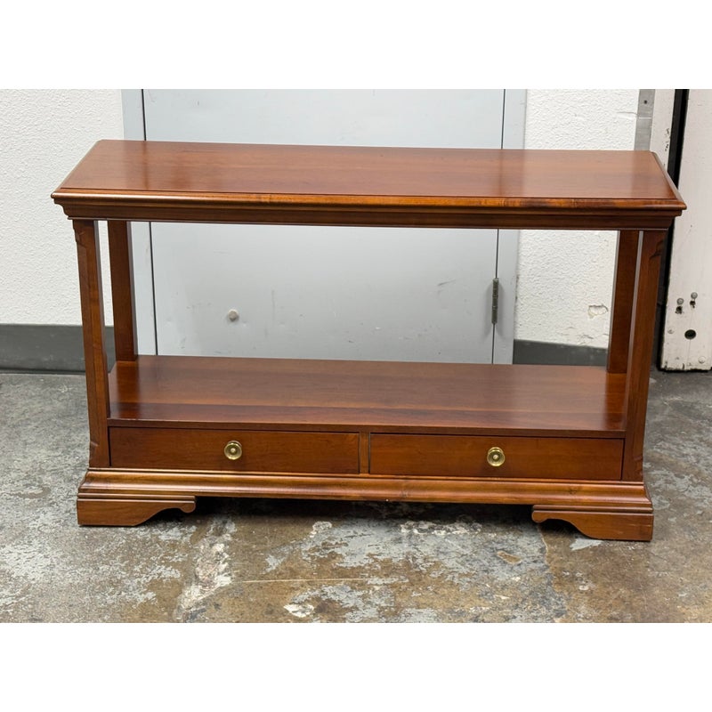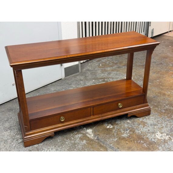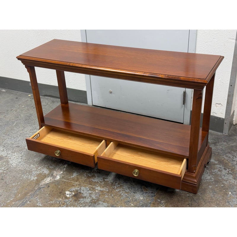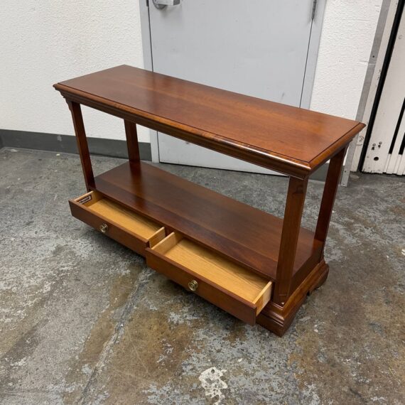 Design Plus Gallery presents a Double Drawer Mahogany Finish Console/Entry Way Table. The table is just a great addition in a variety of manners; to greet you when you get home, to hold your television in a guest room, to sit suitably behind your sofa in great room, the designs are endless. Is in good condition with minimal wear for its usage.