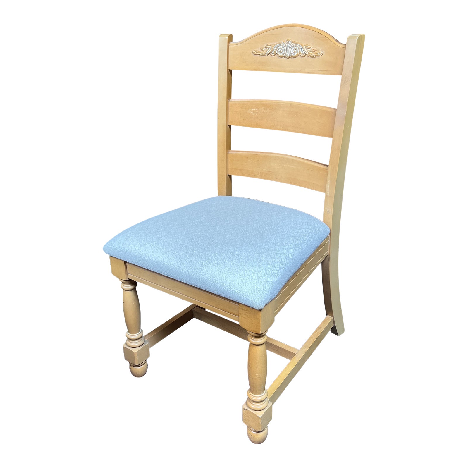 Design Plus Gallery presents a Carved Wood and Cream Upholstered Seat from Broyhill Furniture. Key elements to the quality of this ladder back side chair are carved front legs, stretcher for additional strength, and scroll carving on seat back. Has some surface wear but in overall good condition. Made in USA.