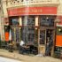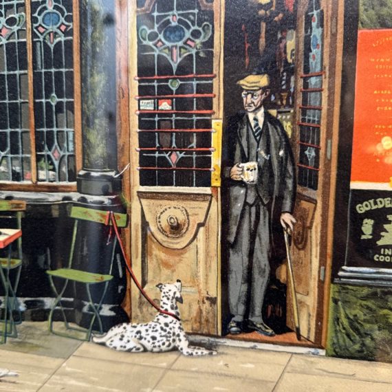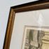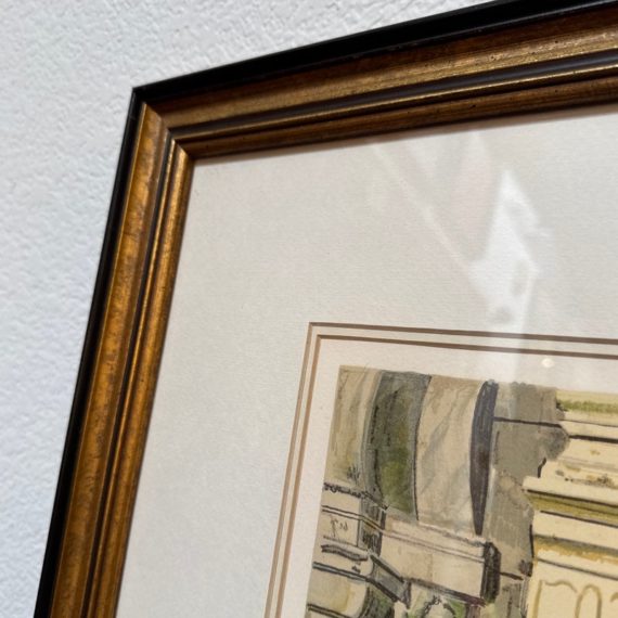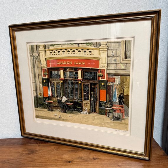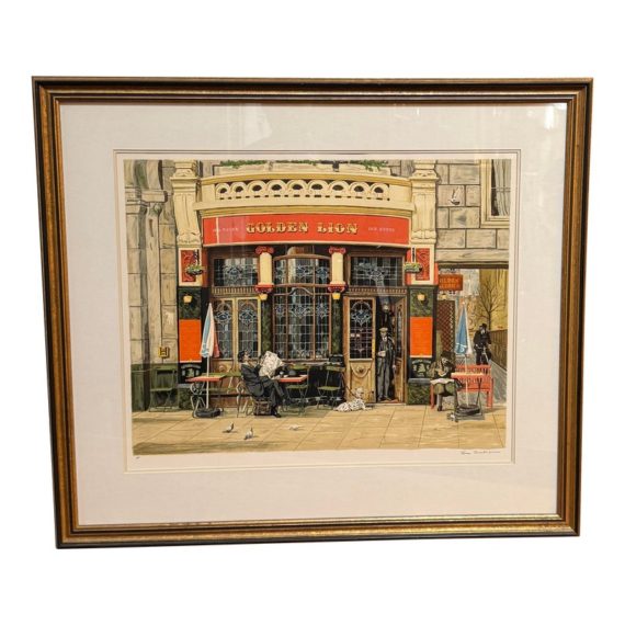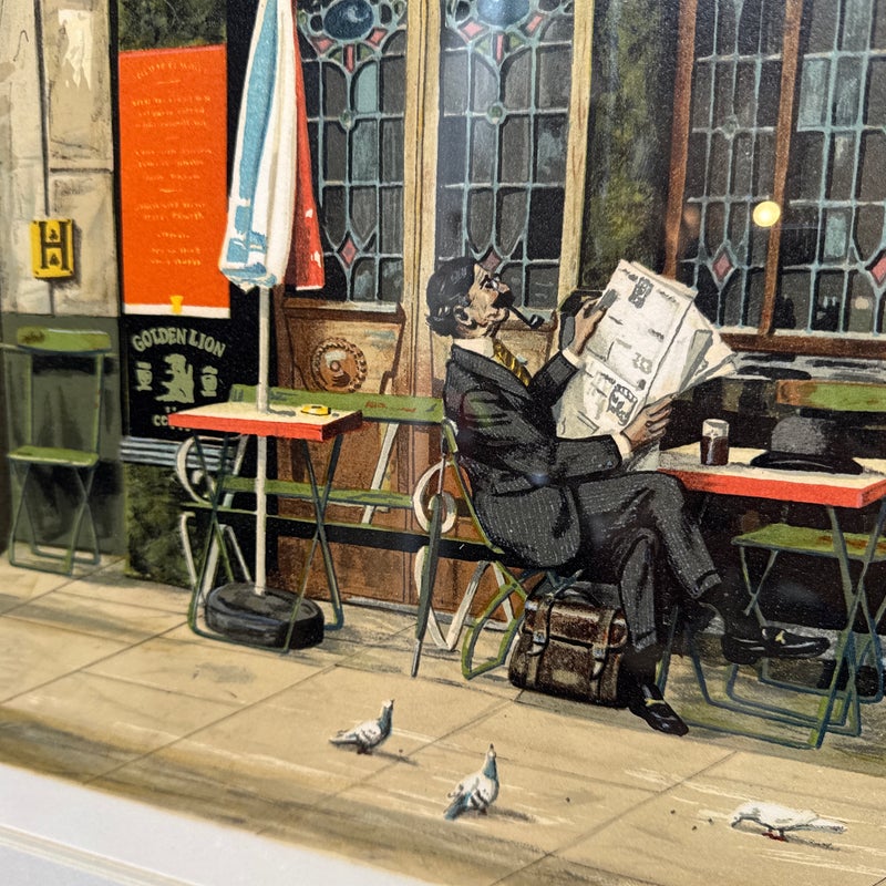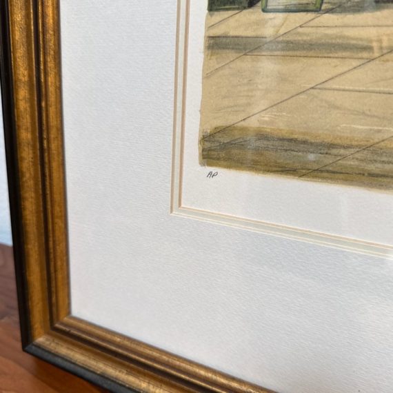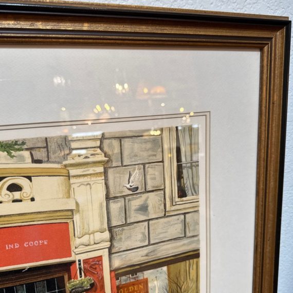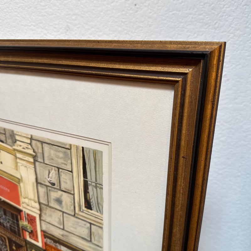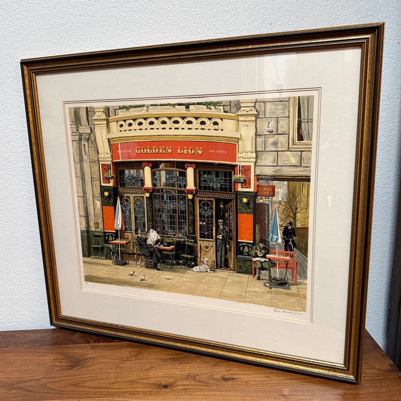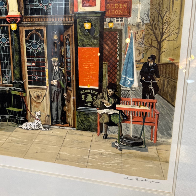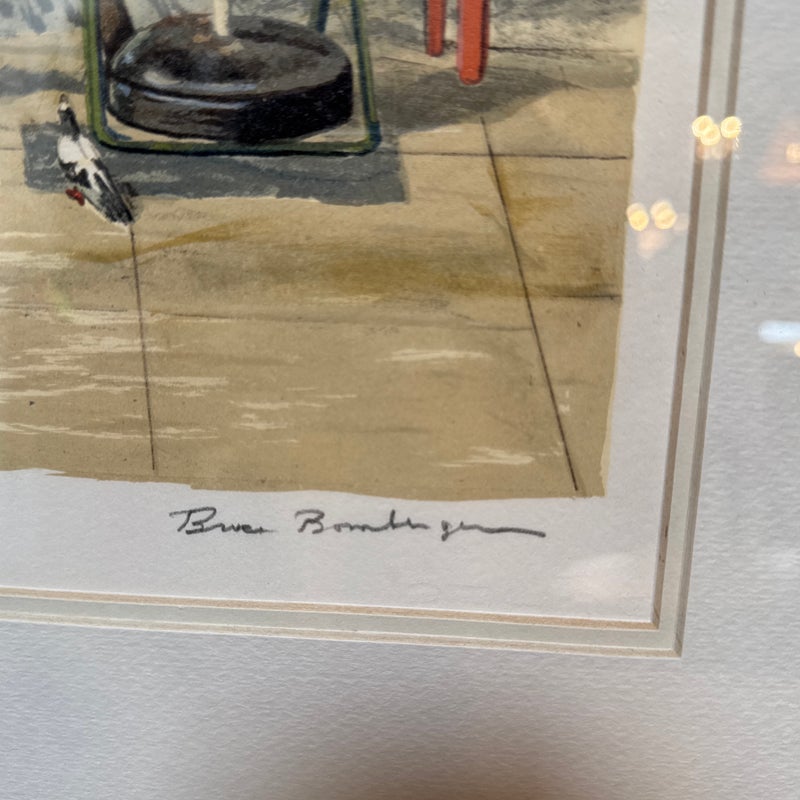 Design Plus Gallery presents Golden Lion, an artist print by Bruce Bomberger. The beautiful illustration captures a quiet moment in time, a sidewalk view complete with pets and pigeons. Professionally matted and framed, signed by artist on lower right. Little wear; condition is good for age and use.