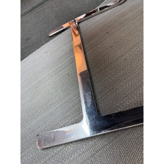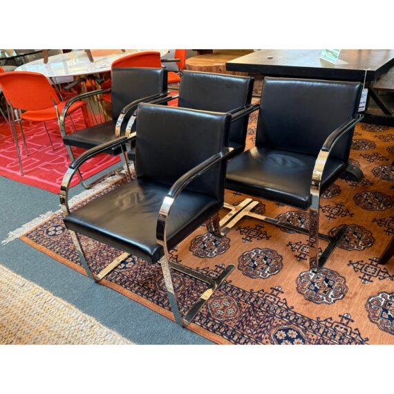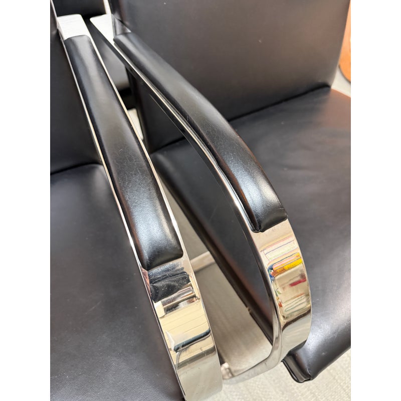 Design Plus Gallery presents a Pair of Cantilevered Leather + Chrome Chairs from Brueton. These chairs are a timeless classic with seamless stainless steel frames and hand crafted upholstered seat and backs. They have a streamlined shape that can work in the home, office, and more. Overall the chairs are in good condition with wear that is consistent with their usage.