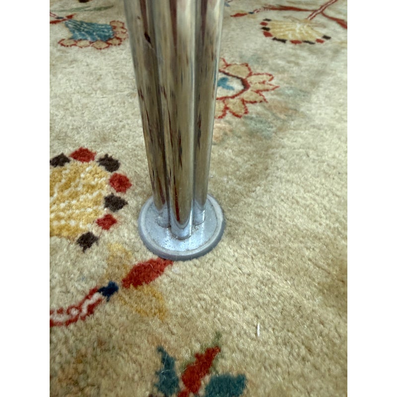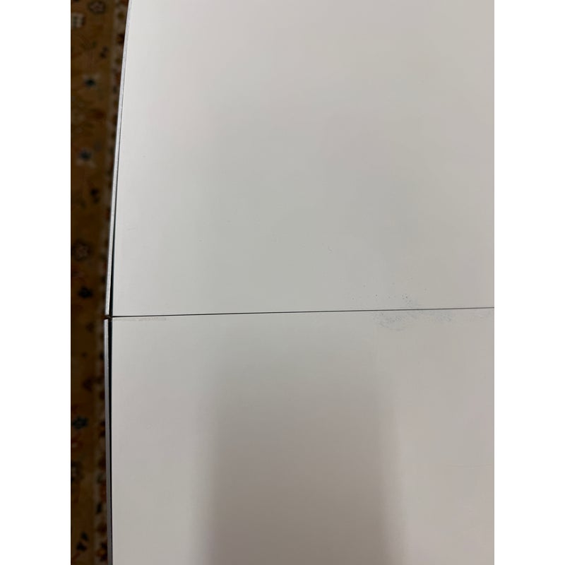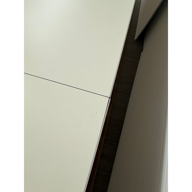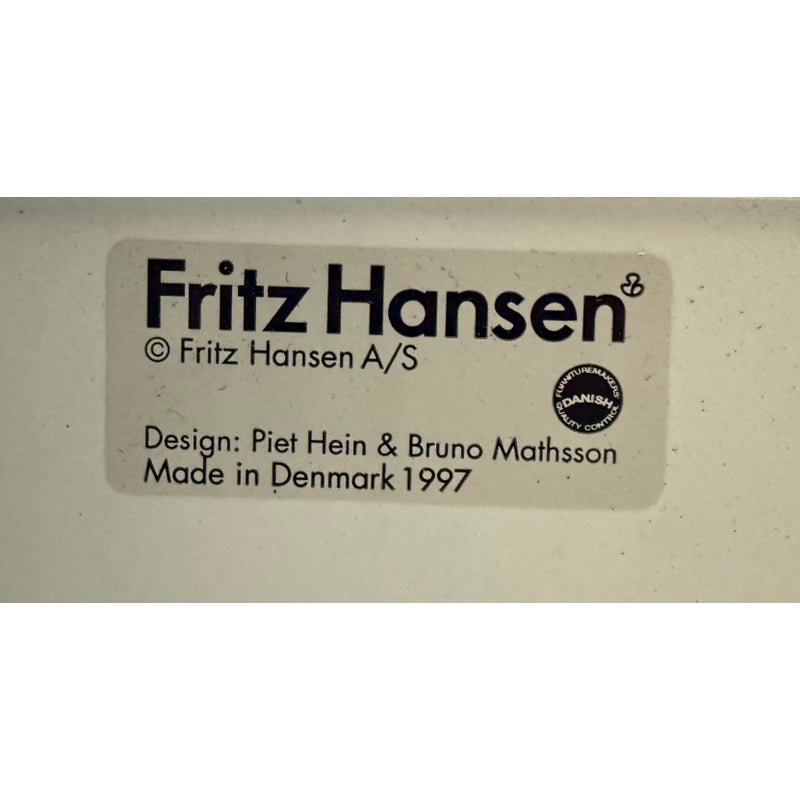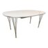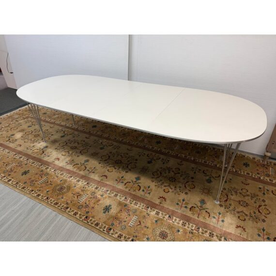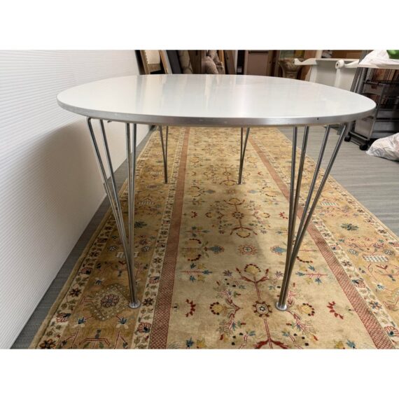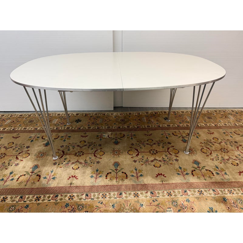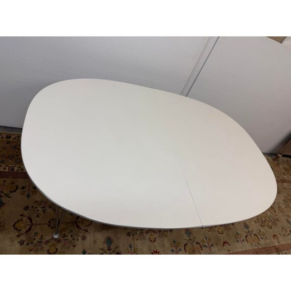 Design Plus Gallery presents the Super-Ellipse White Dining Table by Bruno Mathsson and Piet Hein for Fritz Hansen. The Super Elliptical Table (1968) takes its name from the super ellipse, a shape that merges oval and rectangle and came to be seen by the designers as the most visually pleasing shape for any number of applications. Seating six people, it has polished chrome legs and an easily cleaned white laminate top. This table is appropriate for use as a home dining table or an office conference or cafeteria table. Original design and licensed manufacture by Fritz Hansen. Visible wear is present with slight discoloration to the laminate but is overall in good vintage condition. Made in Denmark.