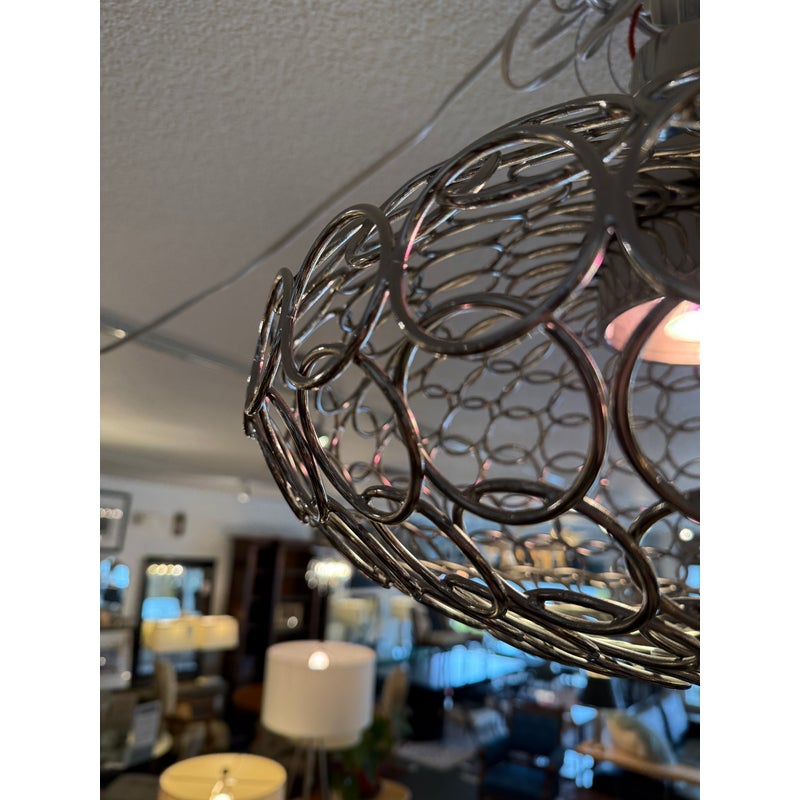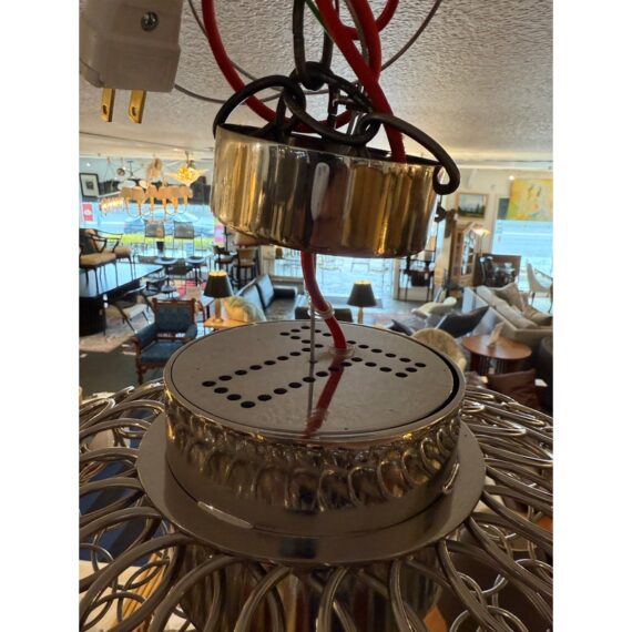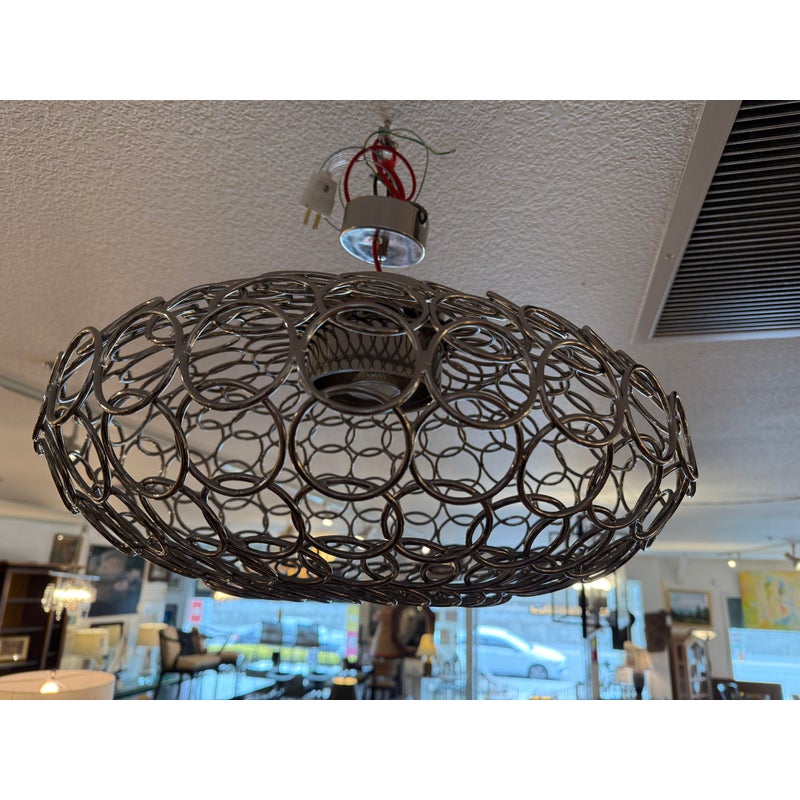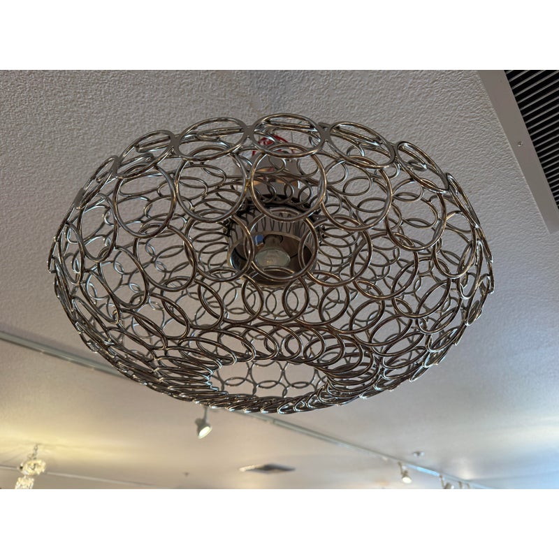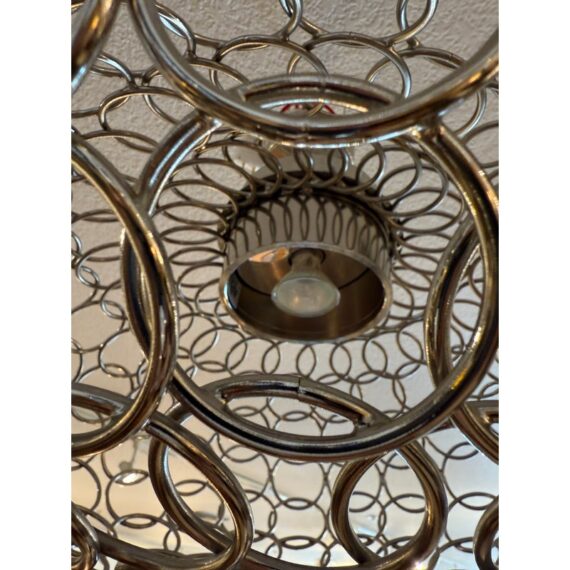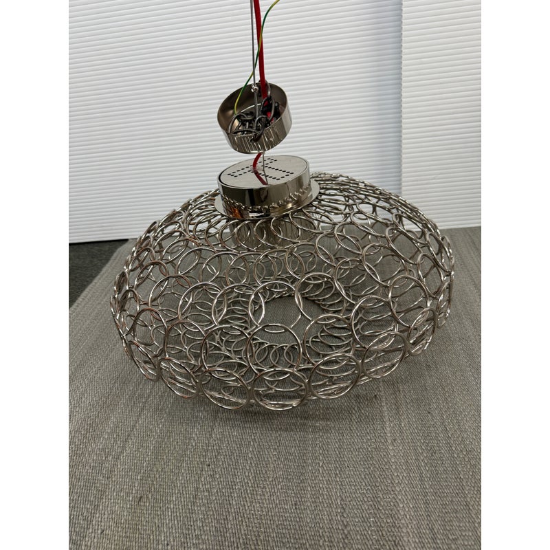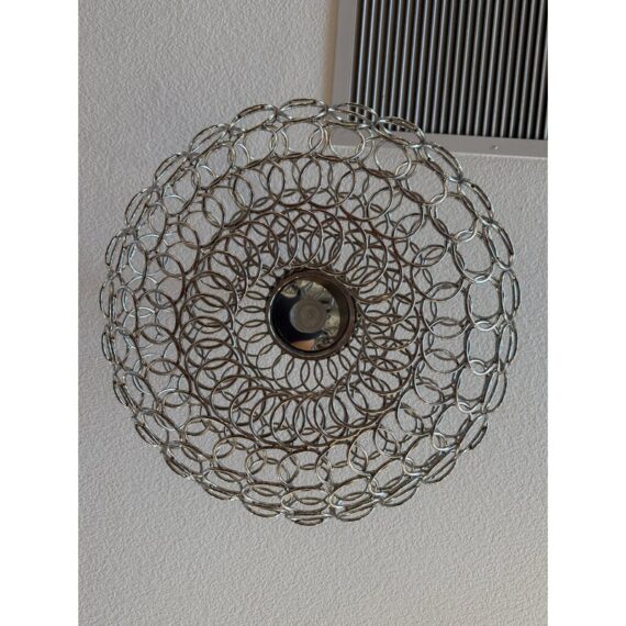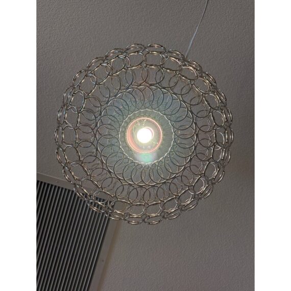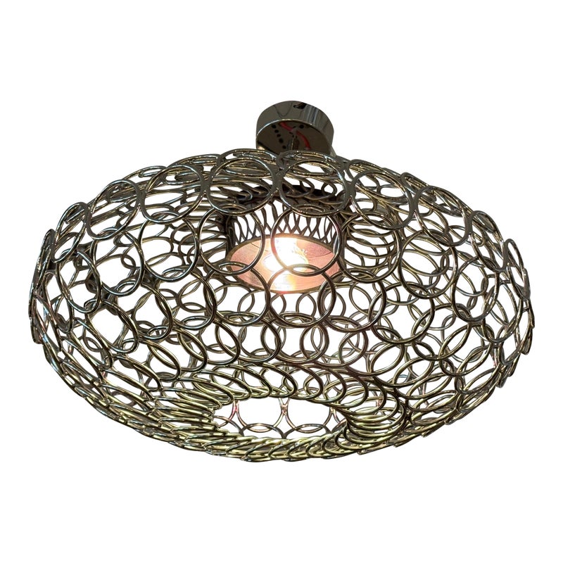 Design Plus Gallery presents a G.R.A. Round Suspensions from Terzani. Designed by Bruno Rainaldi. A constellation of interlocking metal rings forms a delicate, openwork saucer—sculptural by day, magnetic when lit. The airy lattice allows light to breathe, projecting mesmerizing, ever‑shifting shadows that animate walls and ceilings. The finish is a Silver Nickel. In good condition, visible and minimal wear from usage. Made in Italy.