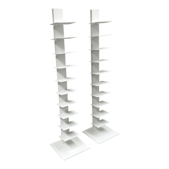Design Plus Gallery presents a pair of Bruno Rainaldi Sapiens Tower Bookcases in White. This is the ten shelf version designed to hold up to 50 books. The powder coated steel is expertly engineered with a tilt to fasten mechanism for each shelf. Some of the shelves are slightly bent, bookcase is in good condition. Unique orientation is sculptural while being a great space saver for small spaces. Made in Italy.