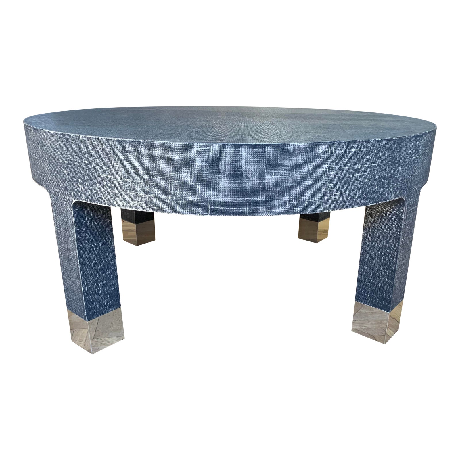 Design Plus Gallery presents a Dakota Round Coffee Table by Bungalow 5. A sophisticated and simplicity Dakota collection. The top profile has a distinctive mod curve where the tabletop meets thick, sculptural legs. A chunky, flush, silver sabot pops the design with contrasts in materials, scale, texture and sheen. The burlap wrap frame is in a Navy Blue Finish.