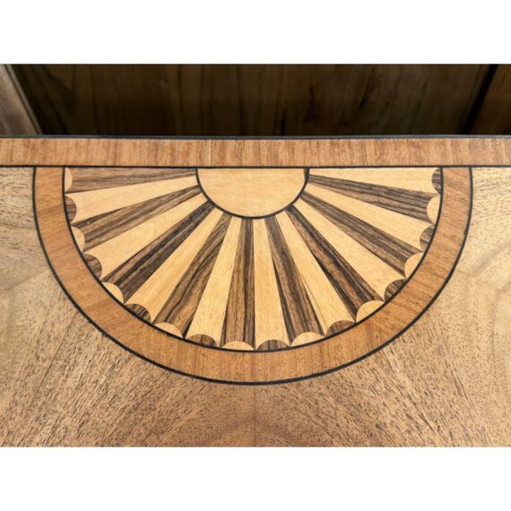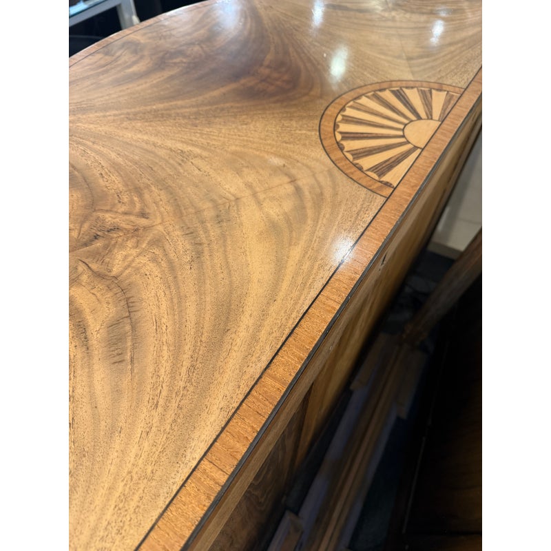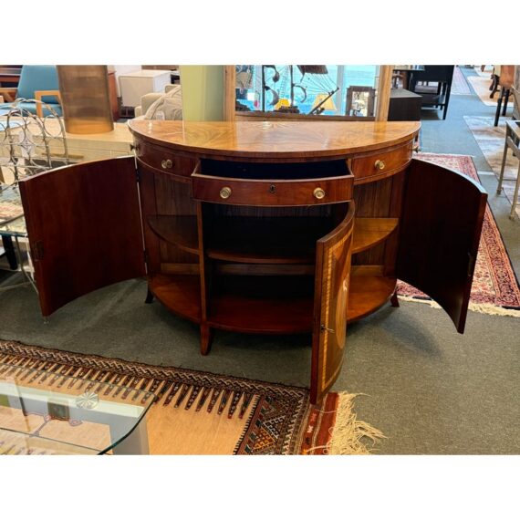 Design Plus Gallery presents a Demi-Lune Commode from Burton Ching. The commode is made with an extensive mid of mahogany, cherry wood inlays, and walnut burl veneer. This well made cabinet is in the George III style with brass handle pulls, dovetail joints, dentil crown molding, and a quite well made radial dial on the surface of the commode. The top has three drawer fronts with only the center drawer to open. It has three rounded cabinet doors with modular shelving inside. The commode was designed to capture the elegance and functionality of the late 18th-century English Georgian period and has a brand plate inside to claim its validity. It is in good condition for its usage. Made in the USA.