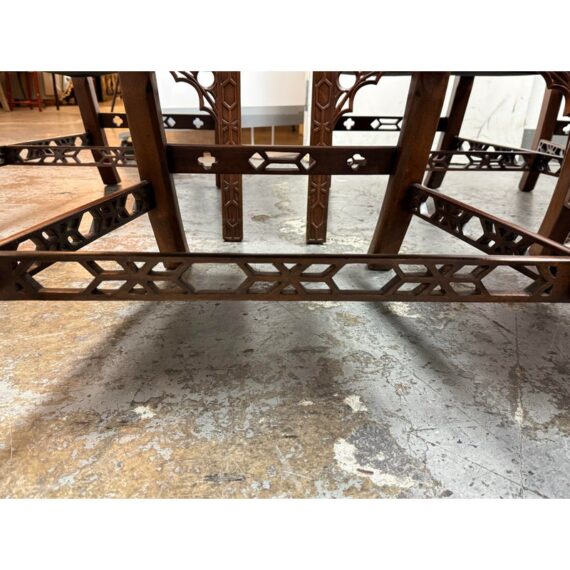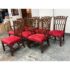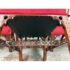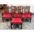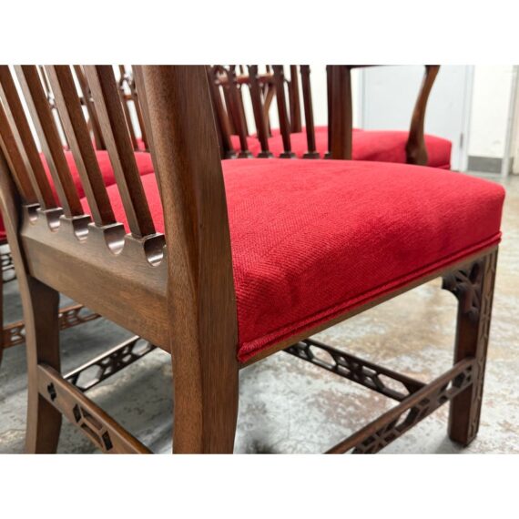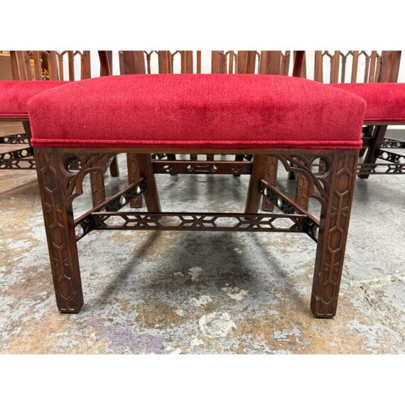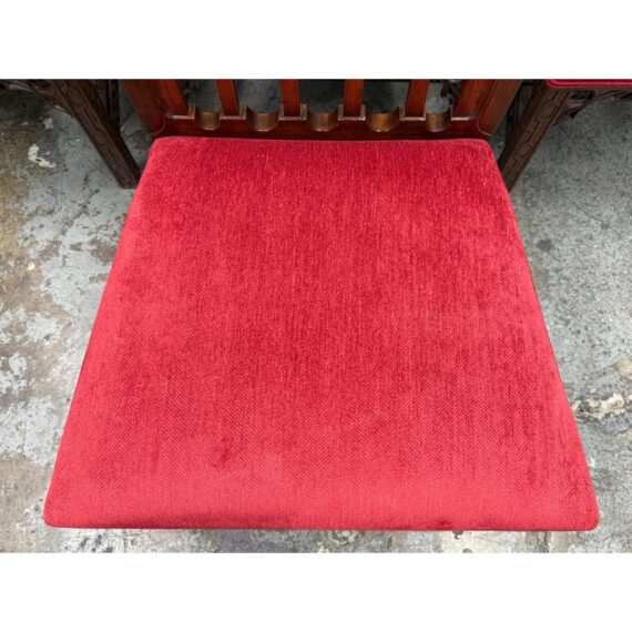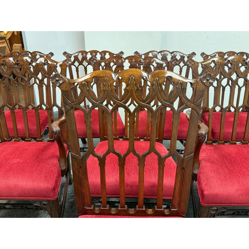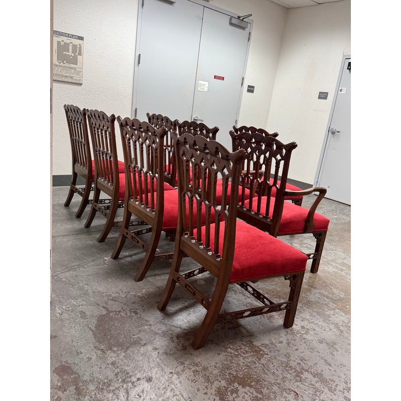 Design Plus Gallery presents a Set of Eight Dining Room Chairs from Burton Ching. The set has the carvings of style that belong to the Gothic Revival movement that was popular in the early 20th century and did well with Victorian furnishings of that time. There are two head of table arm chairs and six side chairs to round out an intimate entertaining set. Each chair has fine carvings on all of their frames, with a red velvet seat cushion. They are in good condition with minimal signs of visible wear for their usage.