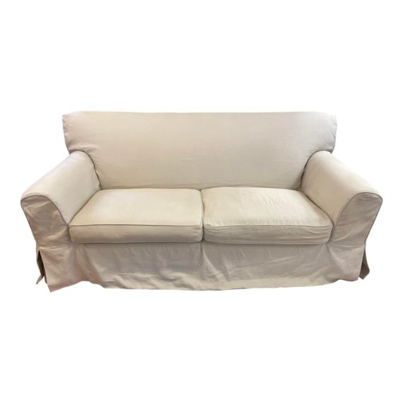 Design Plus Gallery presents a Holly Hunt Fabric Slipcover Sofa. Sofa is a Burton James custom sofa with webbed and spring construction and kiln dried framing. Back is fixed with spring construction as well. Seat cushions are filled with a high density foam and a 25/75 down wrap. Fabric is a tan chenille tone and shows wear and pilling. Slipcover has been custom made with a beige Holly Hunt linen and backed for added structure. Skirted and welted for a casual elegance. Minor wear and pilling on the fabric in areas, skirt could use steaming. Good condition and very comfortable.