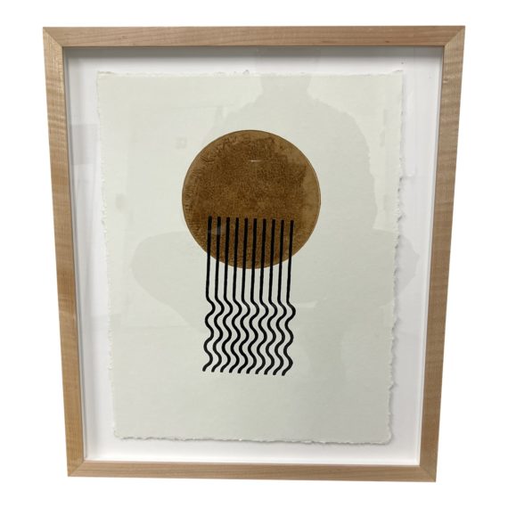 Design Plus Gallery presents a Byway Ochre Woodblock Print in Maple Frame from Block Shop Print. The Byway Ochre represents natural elements in nature captures in a modern + graphic way. The print is created on a wood block on handmade cotton rag paper using natural dyes. Good condition, wear consistent with age + use.