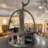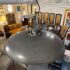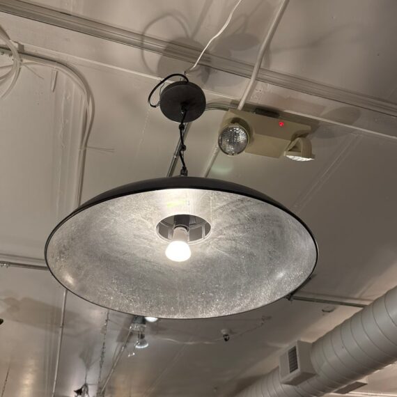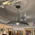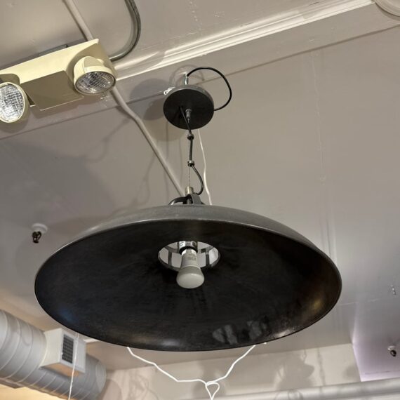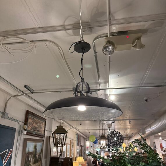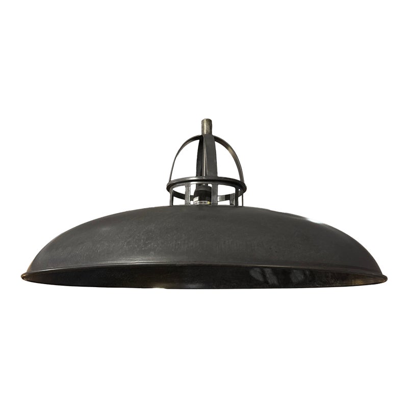Design Plus Gallery presents the Extra Large Victory Light Fixture from CB2. The fixture is industrial, factory like lighting with acid-washed solid iron that is hot-dip galvanized to a raw crystalline gunmetal gray patina. Sleek hands-on canopy downlight, open cage on top casts architectural uplight. Black cord tandems with metal cable for strong suspension. Each rustproof piece has unique variations and color formations that will be darker with time. The style has been discontinued by the brand. Is overall in good condition for its usage.