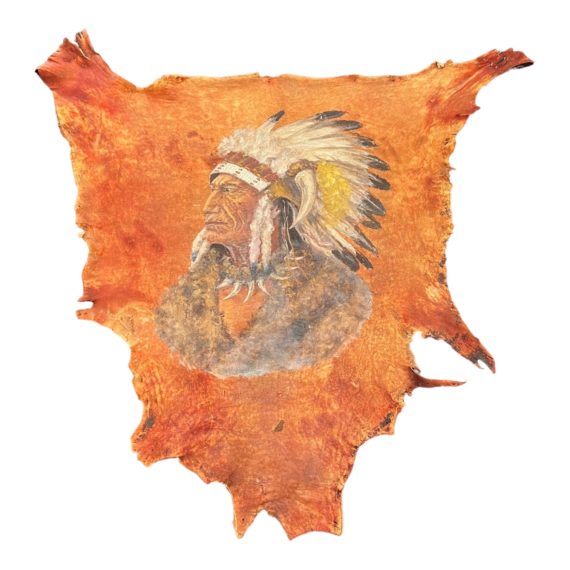 Design Plus Gallery presents an original painting by C.M. Gilber, 1902. A portrait of Chief Multnomah is depicted on an unmounted Buffalo hide. The chief was an 18th-century Willamette leader in the Columbia River Valley, who held significant power in his prime. The unusual medium shows wear and repairs can be seen on the back, as might be expected for the antique painting.