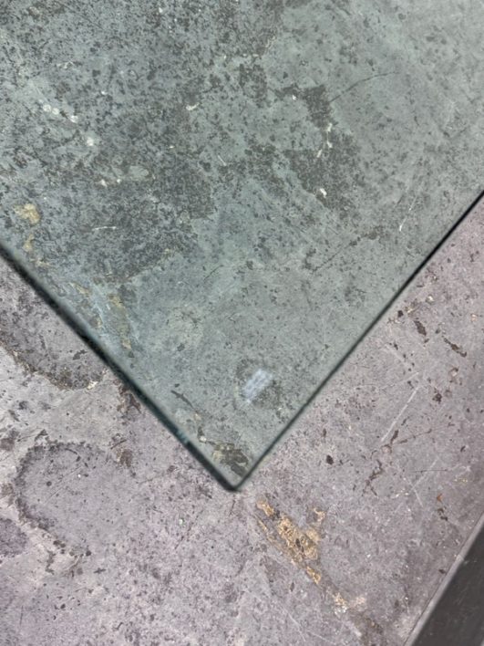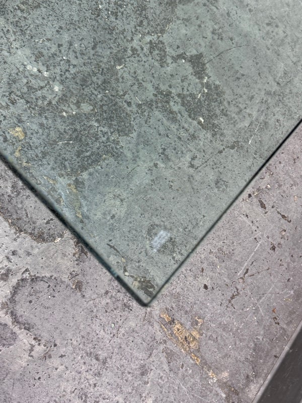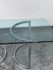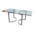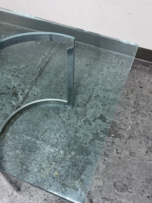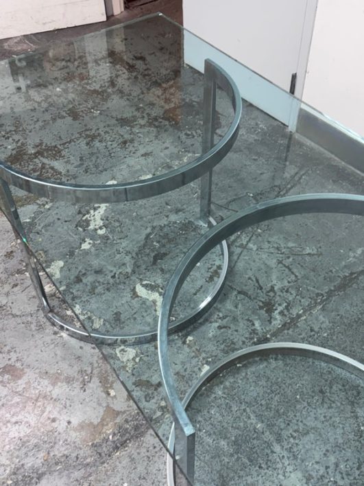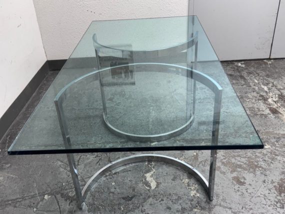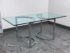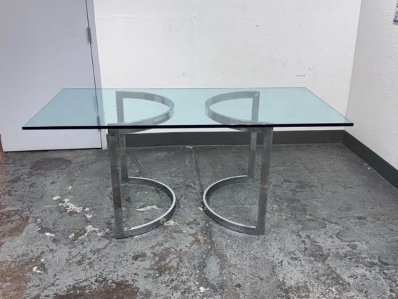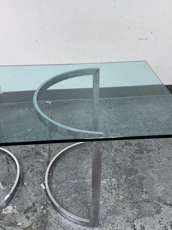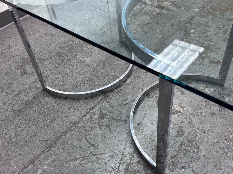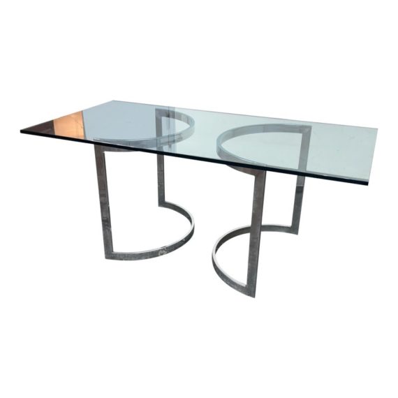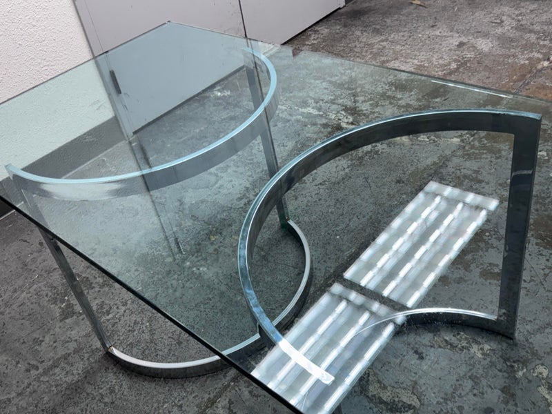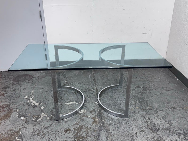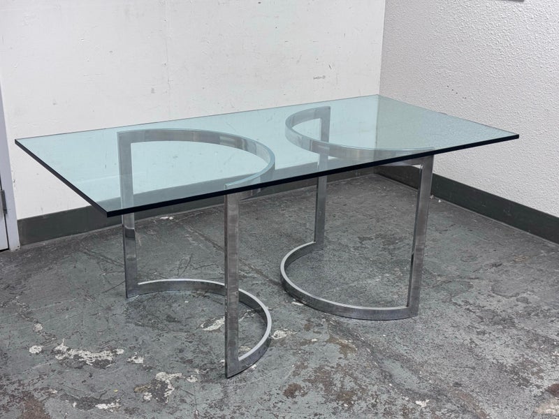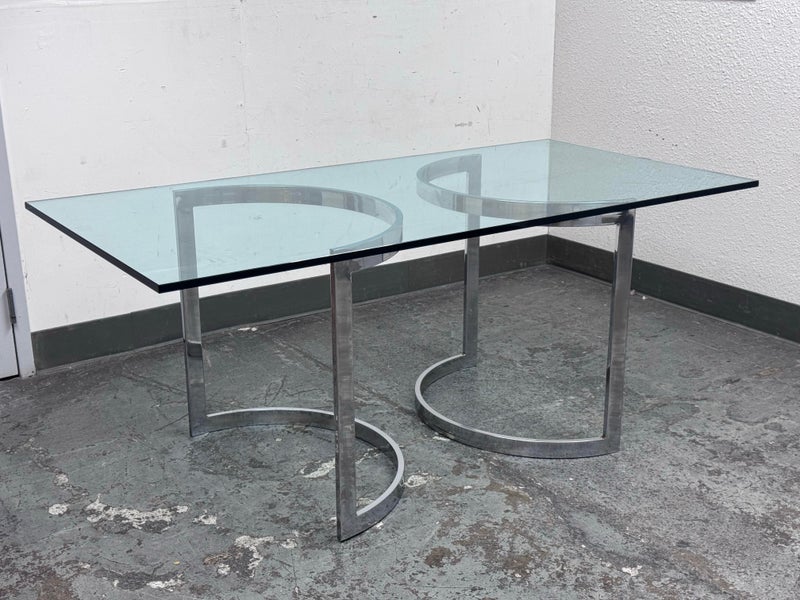 Design Plus Gallery a Chrome Base with Glass Table Top Dining Table from Cal-Style. The glass surface rests on a pair of crescent bases which can change with their configuration, going inwards or outwards. Is in good condition, visible and minimal wear from usage.