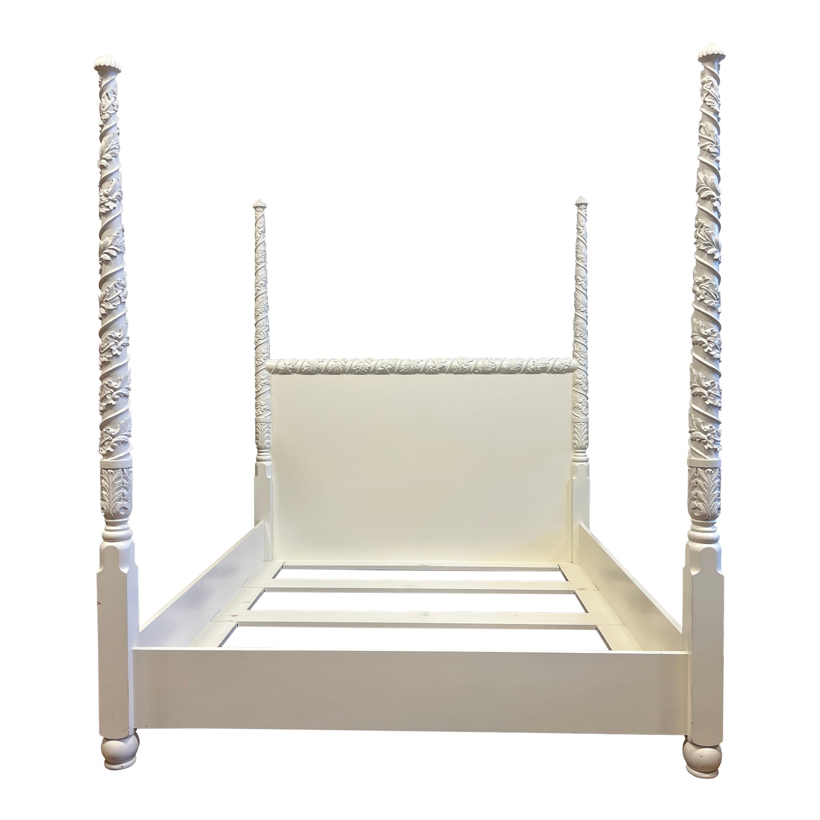 Design Plus Gallery presents a Custom Design California King Poster Bed of French Design. The solid wood frame was painted a white finish with elemental decoration to each of the four posts. Climbing acanthus leaves are spiraling up each of the posts and also on the top of the bed frame. Three wide wood planks allow it to not need/require a box spring. The bed is in good condition, Visible chips and minimal surface wear. The posters do not come apart.