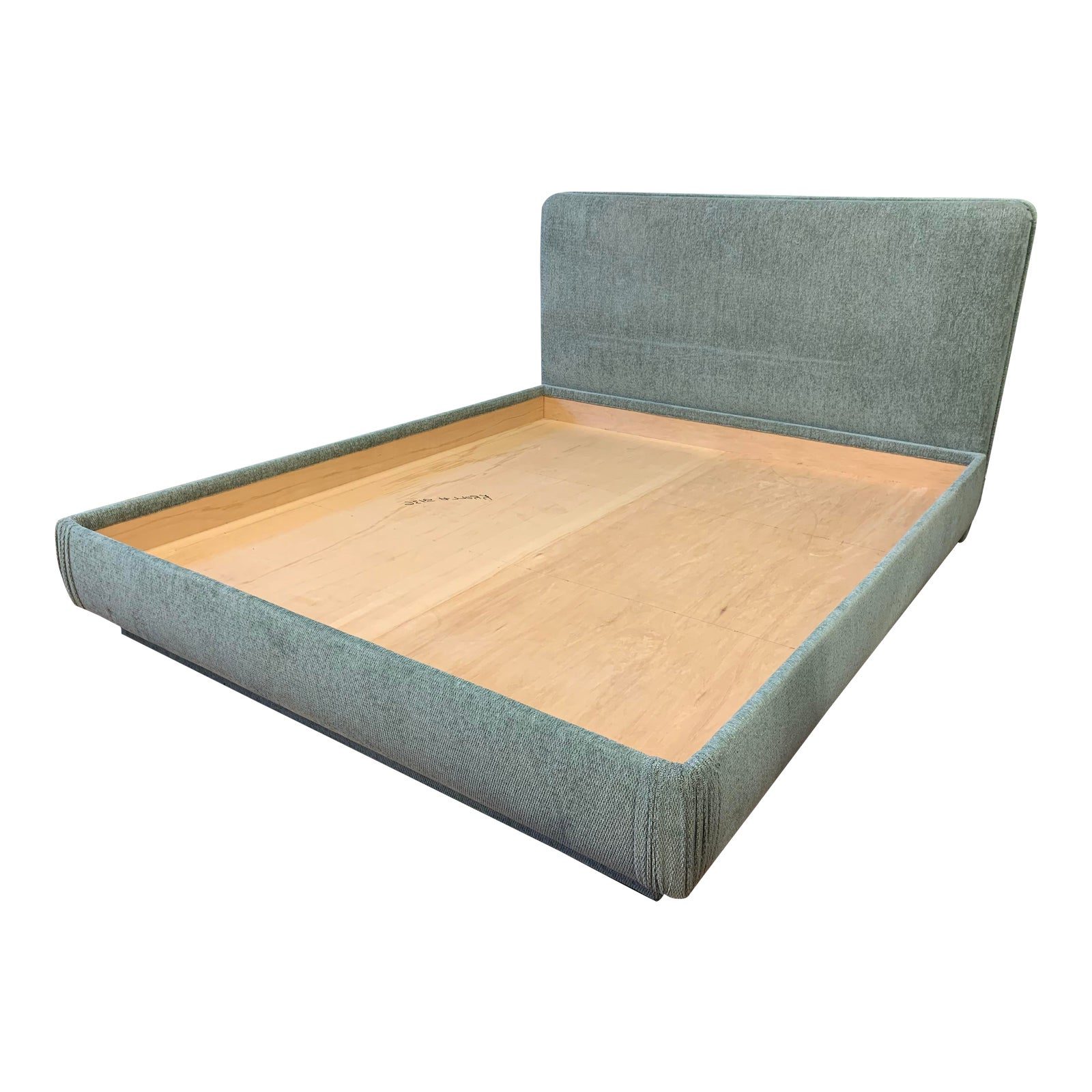 Design Plus Gallery presents a Custom California King Bed Frame by Kroll Furniture. A custom thick upholstered headboard, accompanied with a custom wood platform with upholstered sides and base. The upholstery is a thick linen in a Cyan color. Minor wear on fabric. Made in San Francisco, USA.