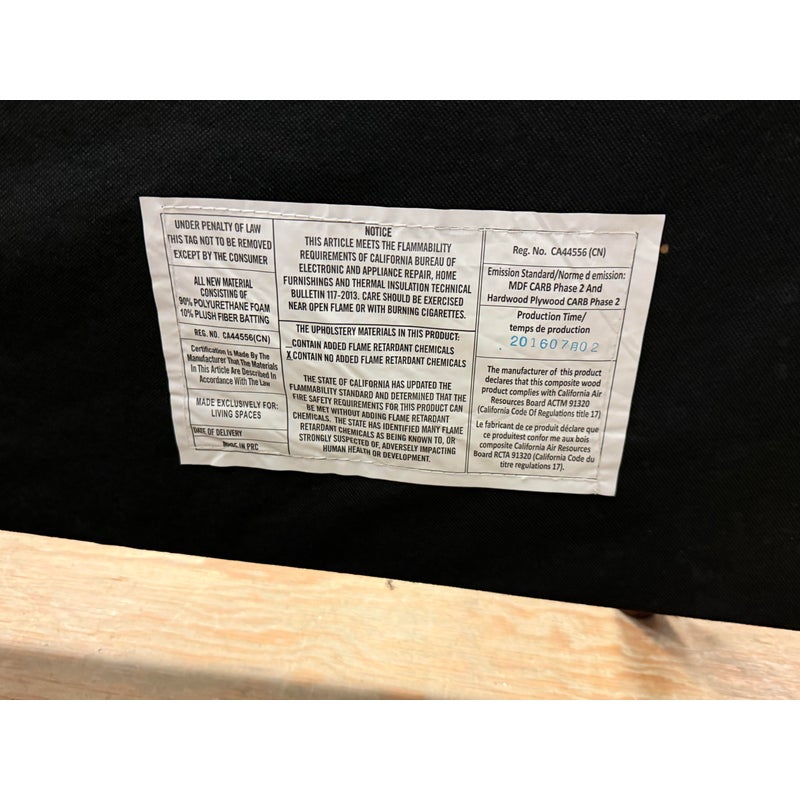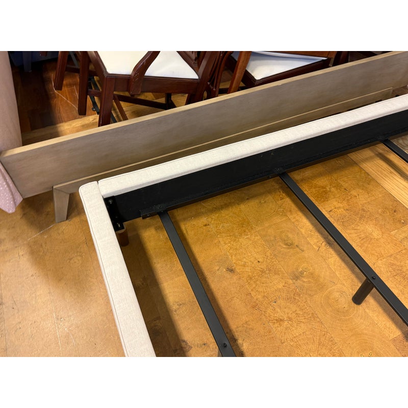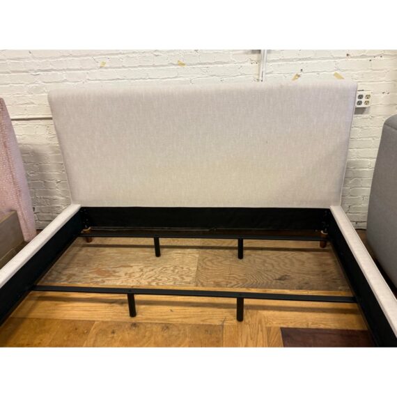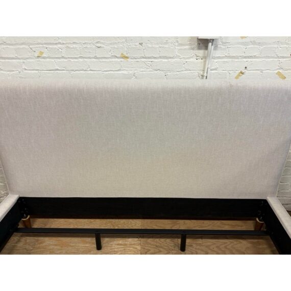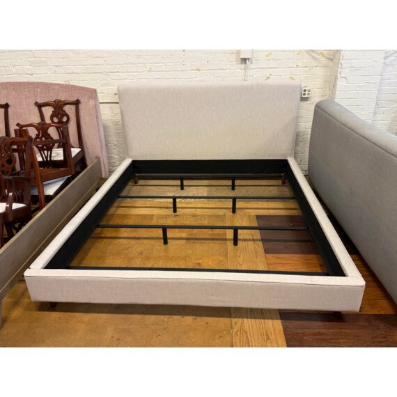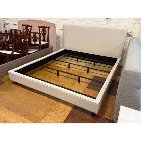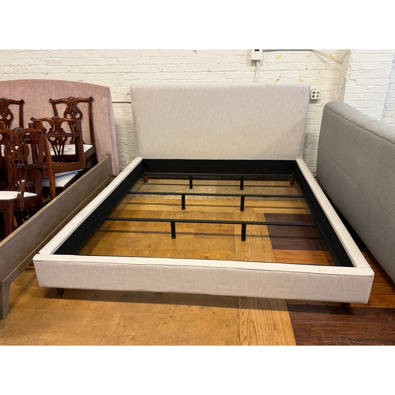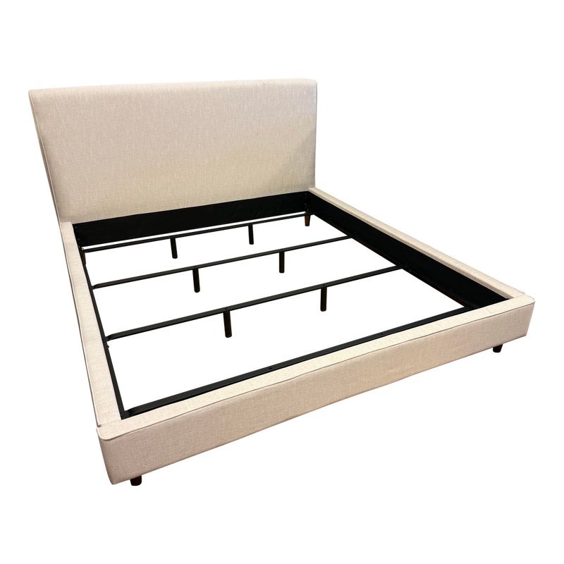 Design Plus Gallery presents a California King Dean Bed Frame from Living Spaces. One of the brands most popular bestsellers, the Dean bed proves that simple can be sensational. With its mid-century modern look, this piece offers all the details you could want: clean lines, tapered legs and a minimalist-chic aesthetic. The design is upholstered in fabric that is OEKO-TEX® STANDARD 100-certified for safety and sustainability. Tailored and sophisticated yet inviting enough to make you want to tuck right in, this will be the highlight of your retreat. Is in good condition for its usage.