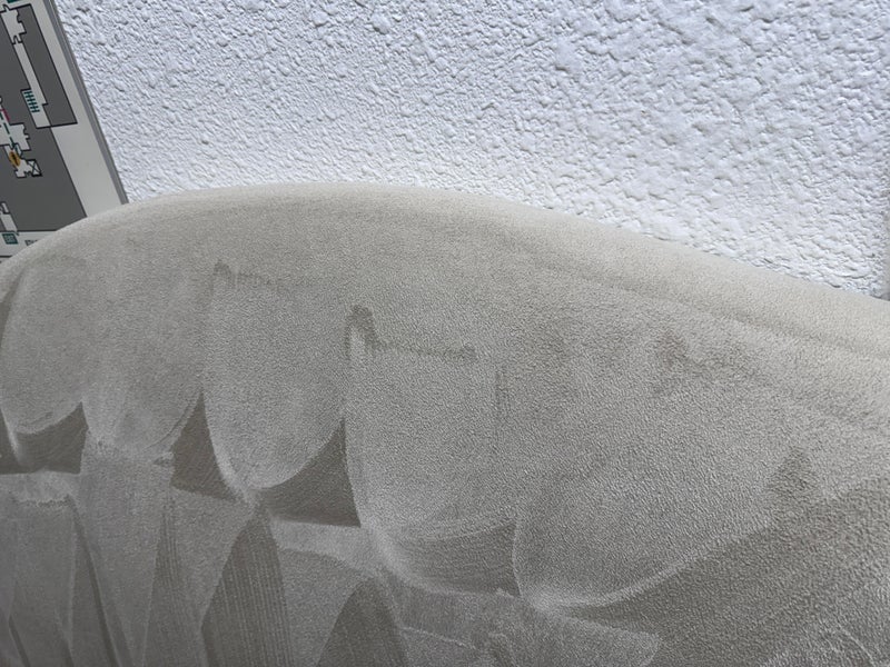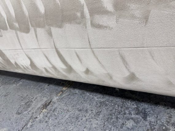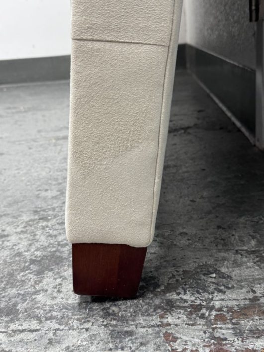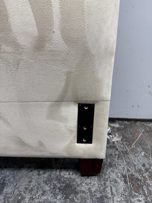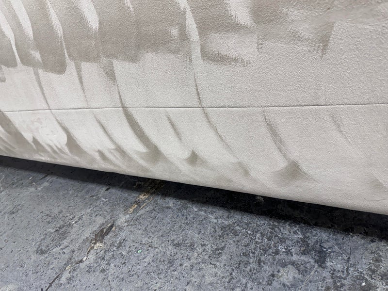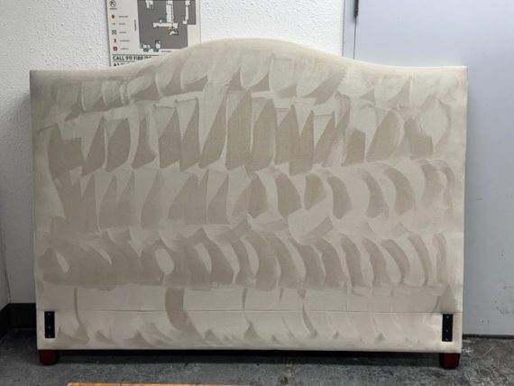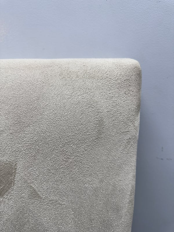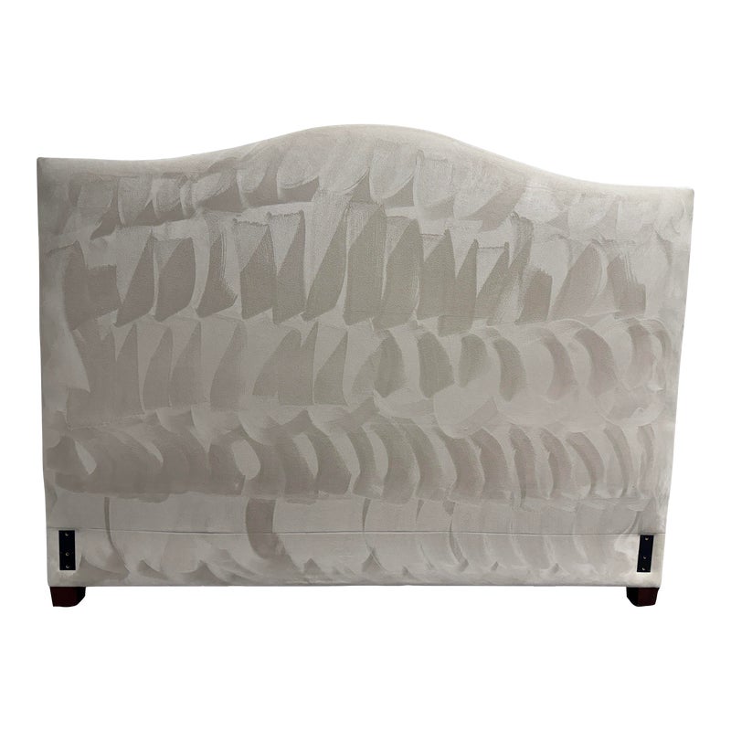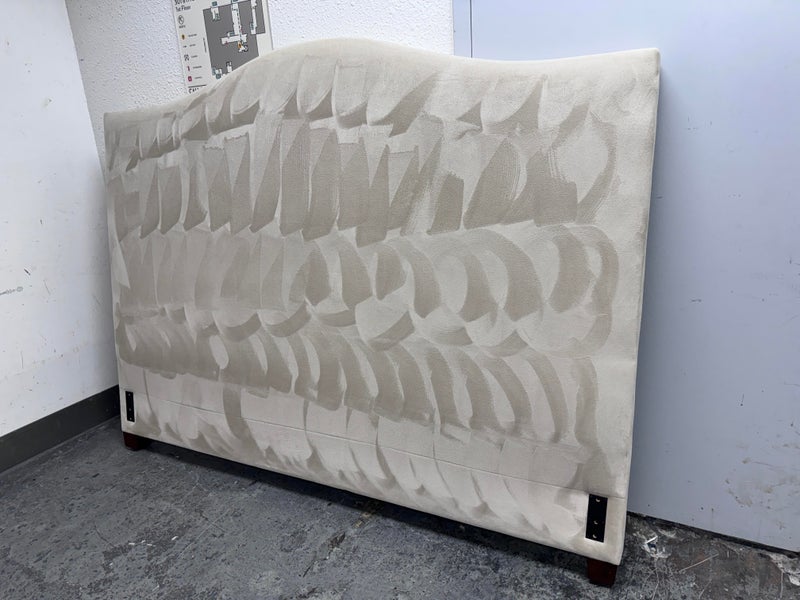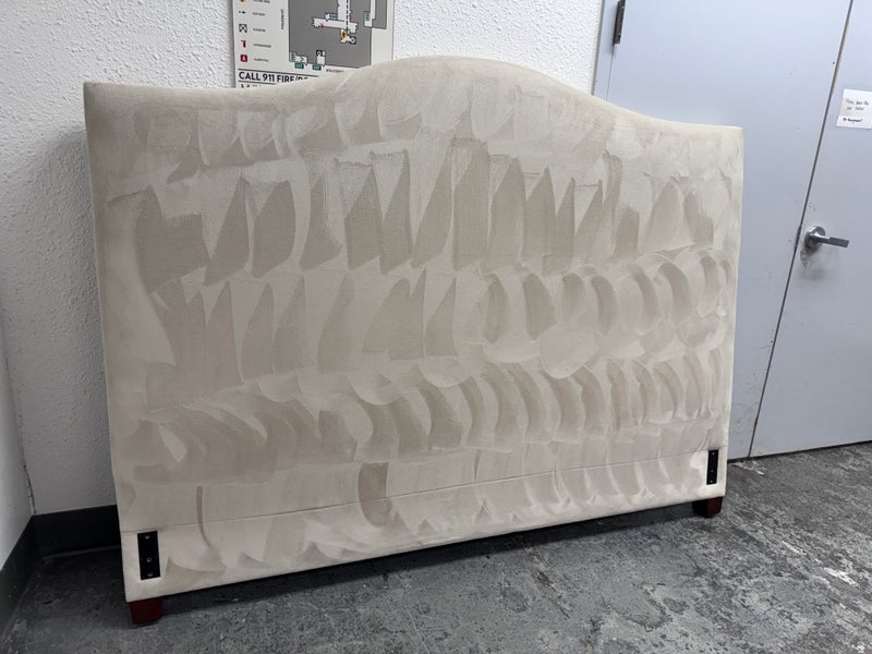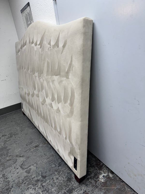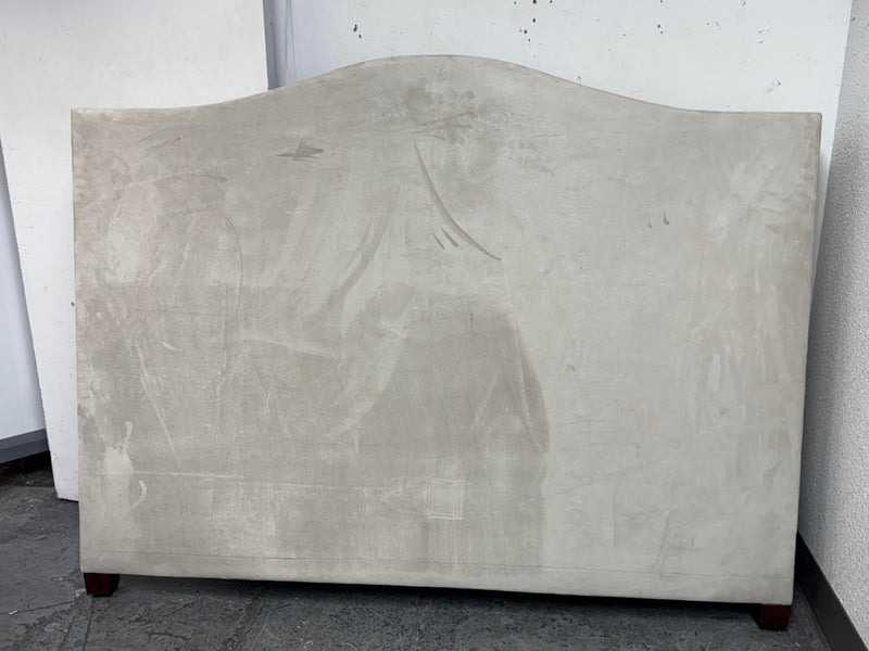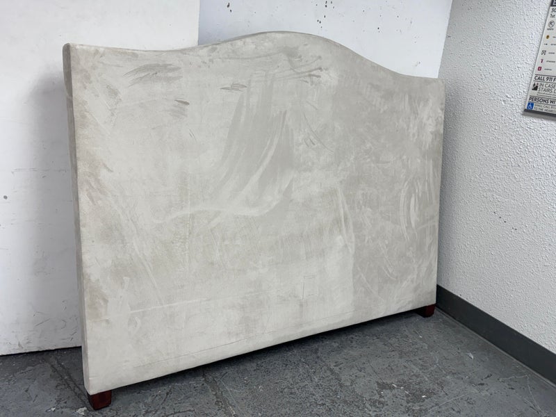 Design Plus Gallery presents a California King Size Headboard by Pottery Barn. Upholstered in a soft Beige Velvet upholstery. In good condition, visible and minimal wear from usage + age. Headboard Only.