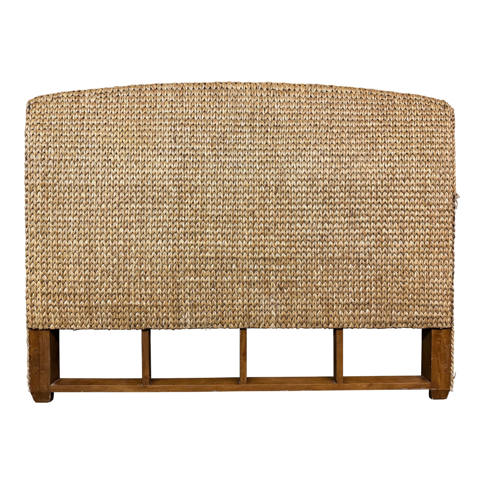 Design Plus Gallery presents a California King Size Head Board by Pottery Barn. Perfect for adding a touch of coastal charm to your bedroom, a stunning piece that combines elegance with natural elements. Crafted from solid wood and wrapped in a woven seagrass material, this headboard strikes the perfect balance between rustic and refined. The natural tones of the seagrass material create a warm and inviting atmosphere. Visible and minor wear from usage + age.