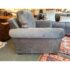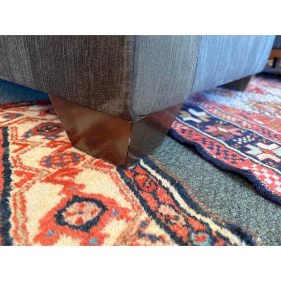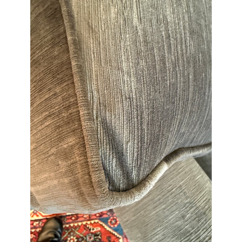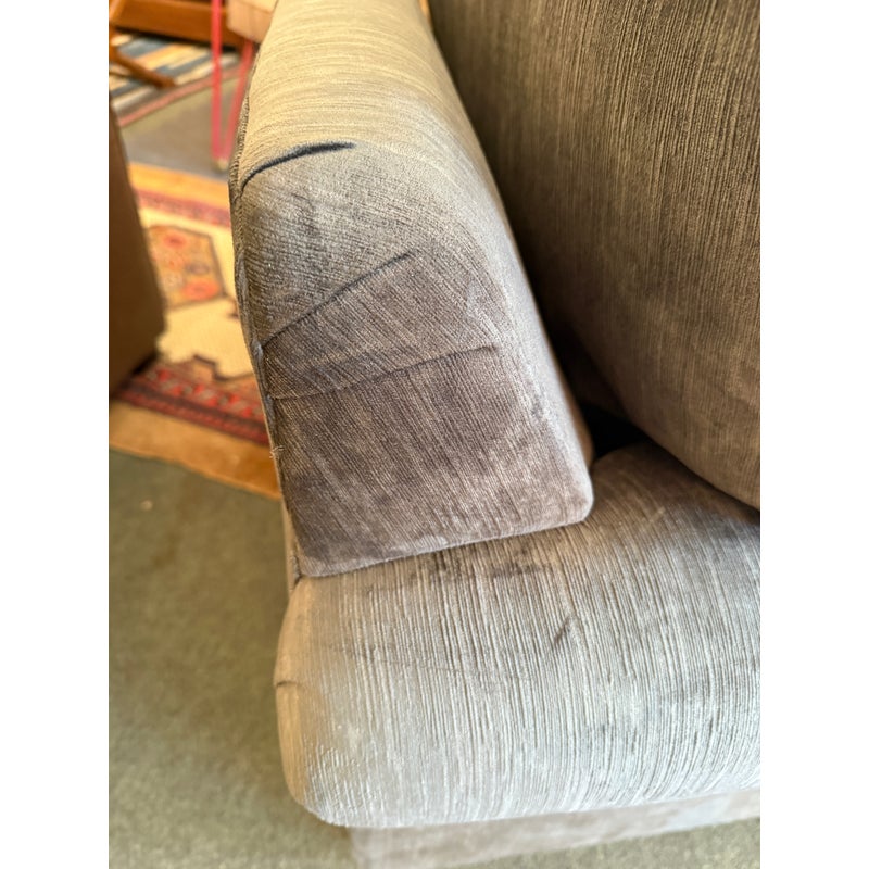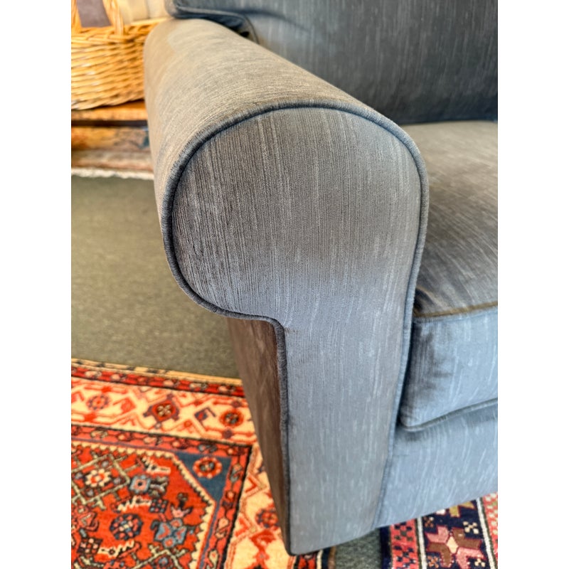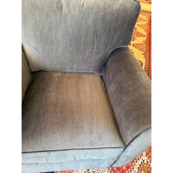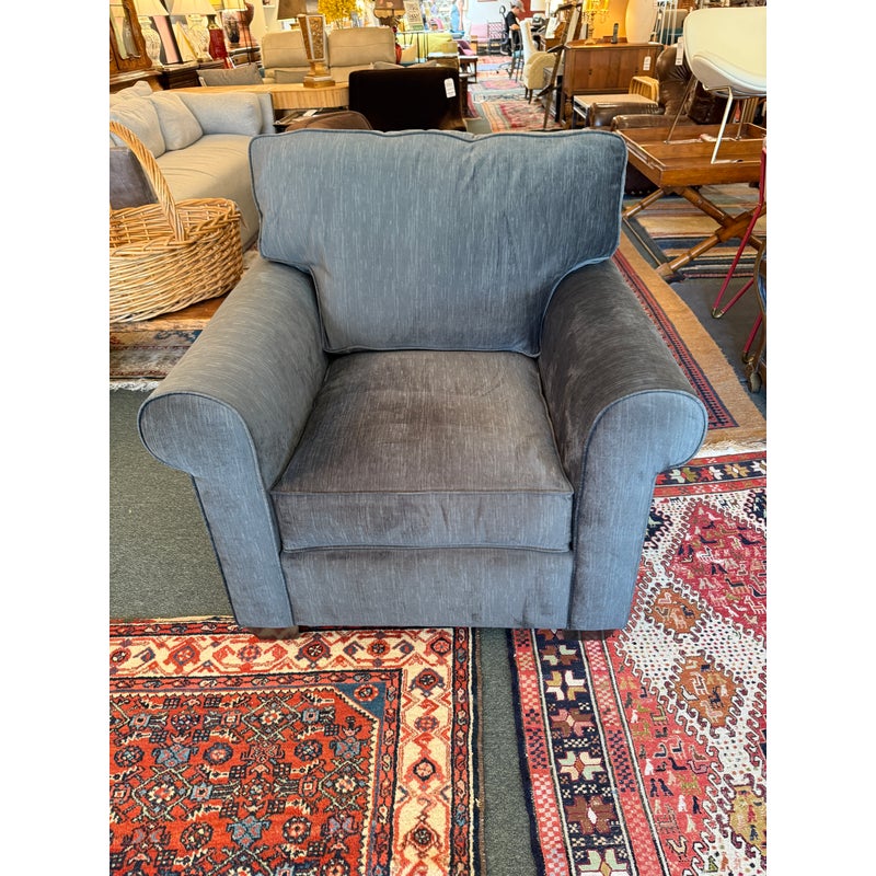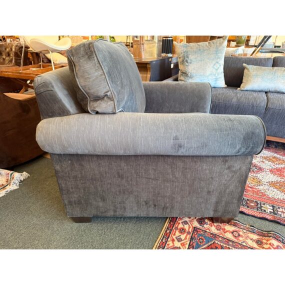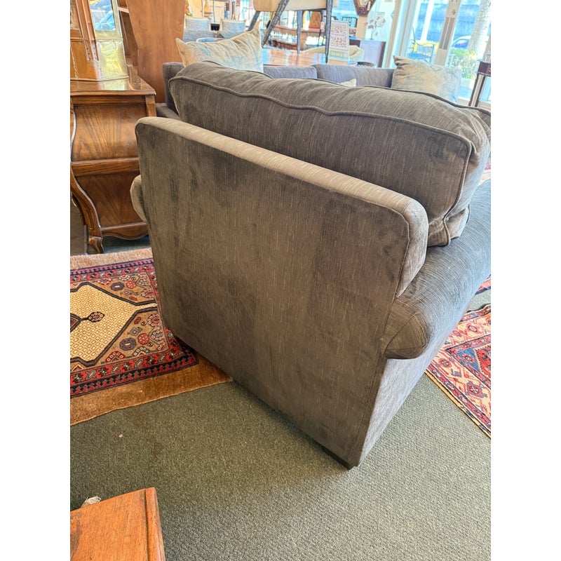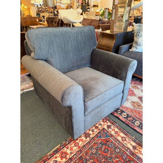 Design Plus Gallery presents a New Roll Arm Chair by California Sofa. Traditional silhouette with roll arm styling, the inviting chair is just as formal as it is casual. Foam filled cushions for comfort, kiln dried solid alder wood and sinuous “no sag” springs for durability. Upholstered in soft, rich gray striated velvet and slightly elevated on dark stained tapered wood legs. Showroom sample, condition is good.