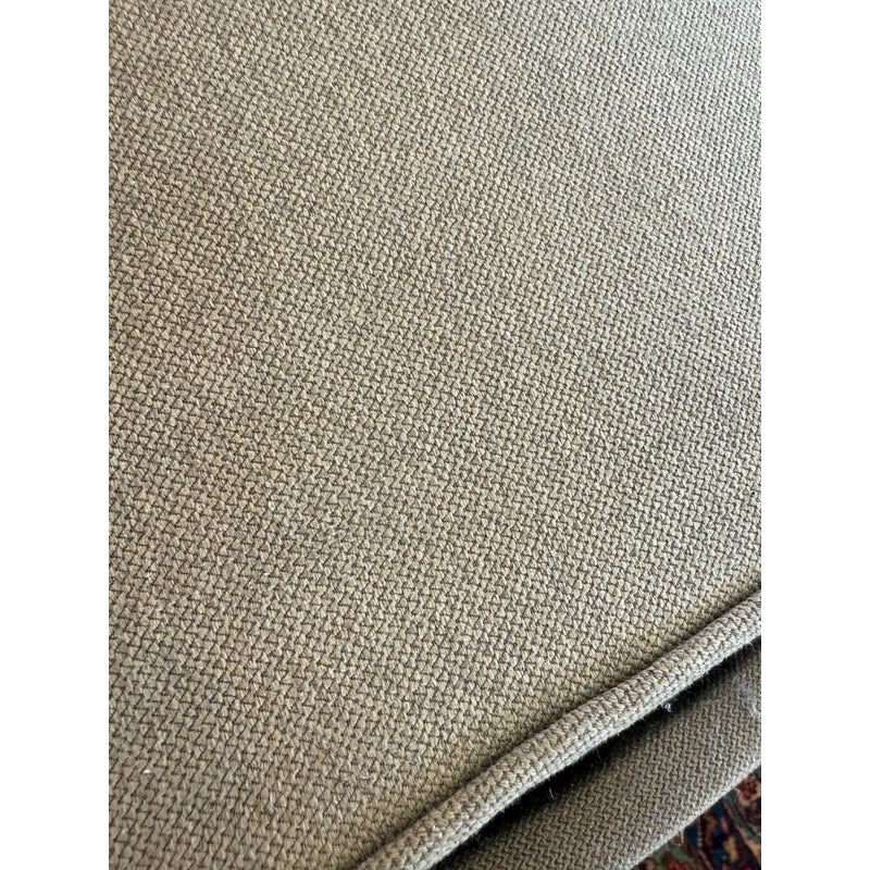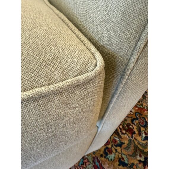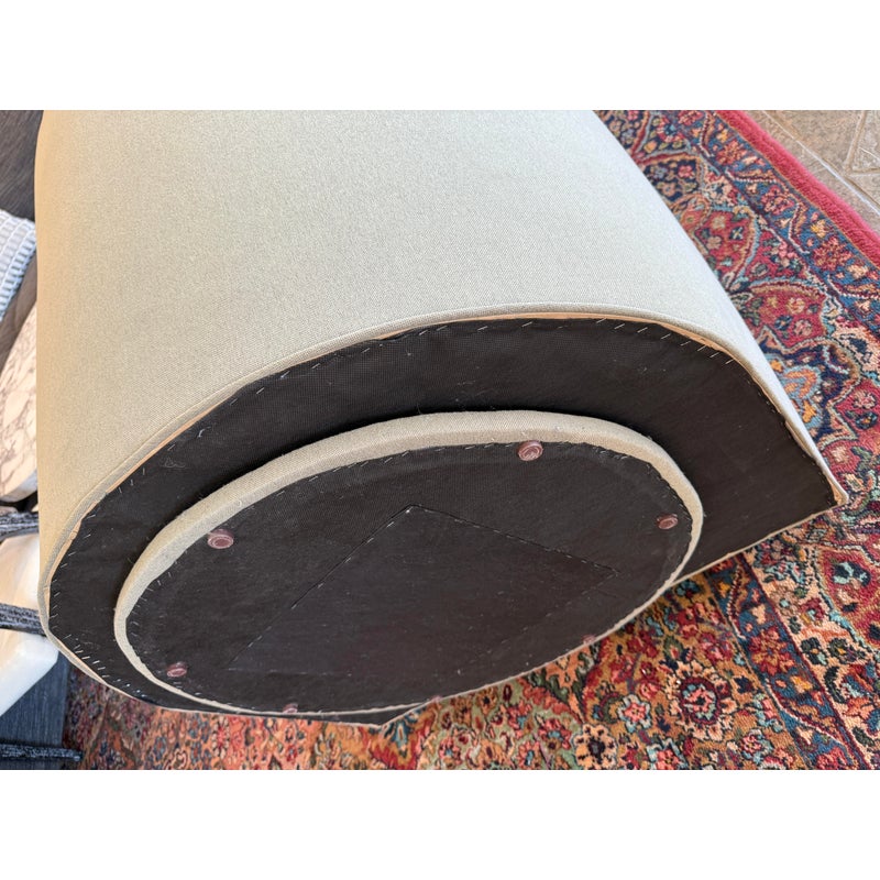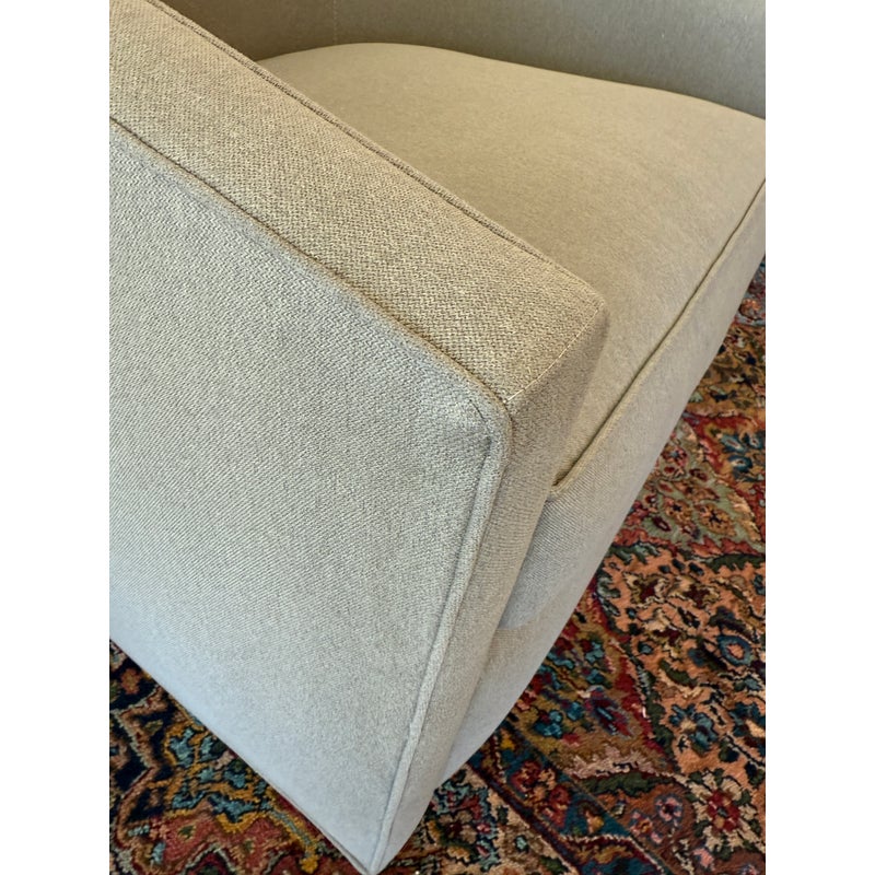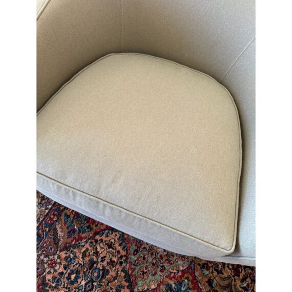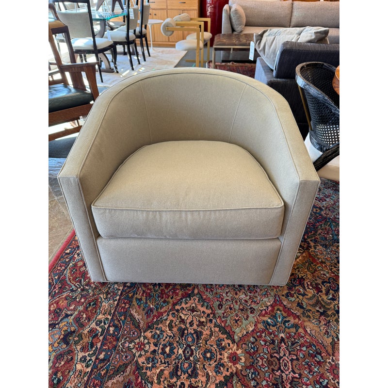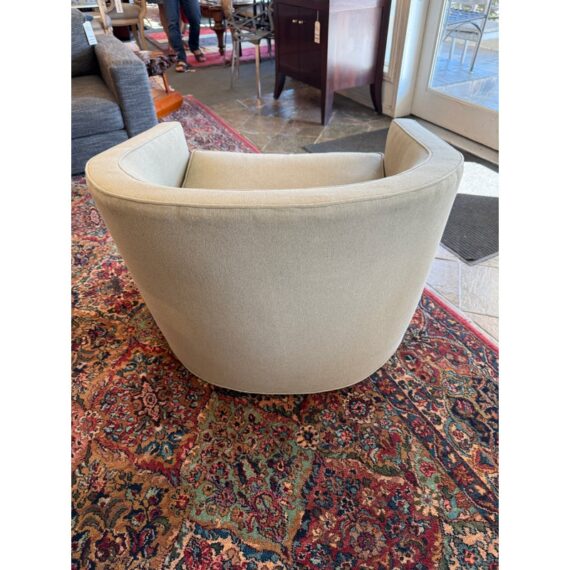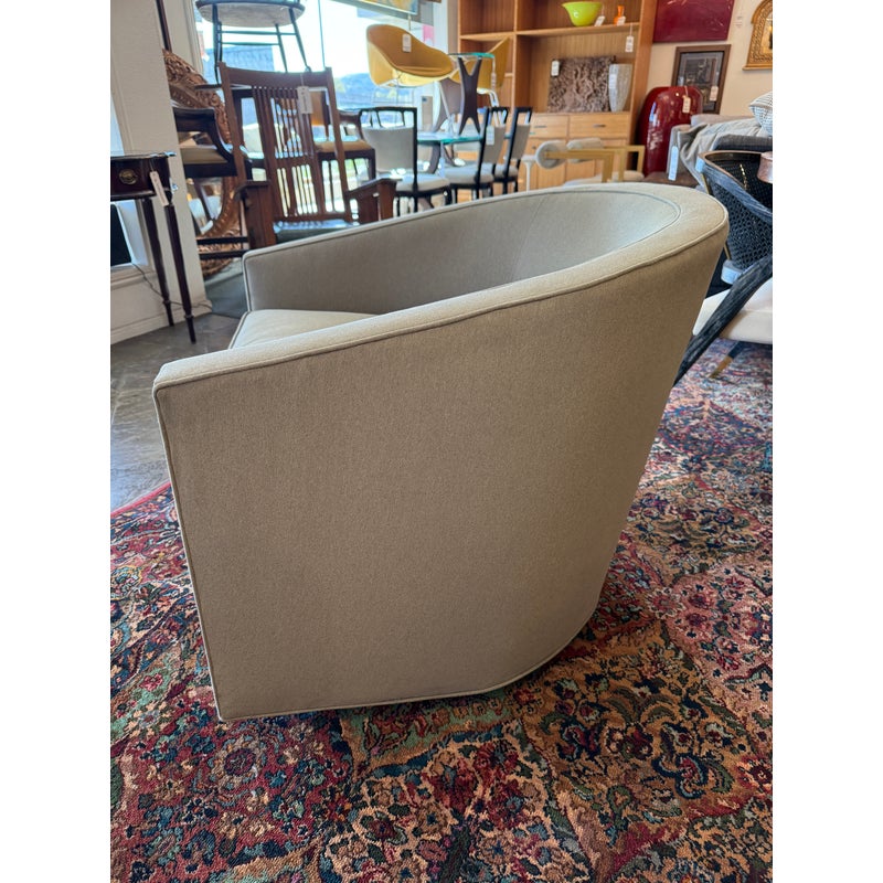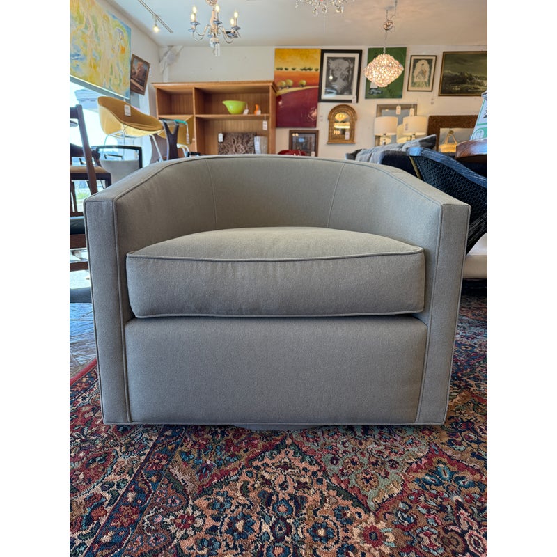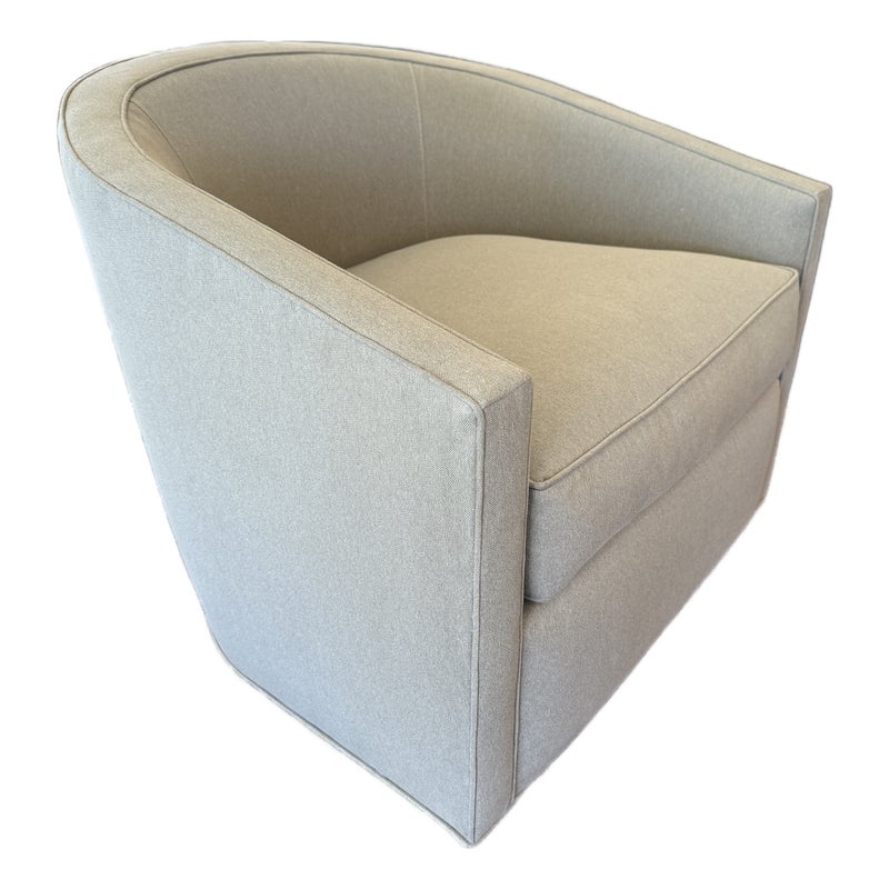 Design Plus Gallery presents a Barrel-Back Swivel Chair from California Sofa. A contemporary silhouette with slope arm, the inviting chair can read formal or casual. Foam wrapped and filled cushion for comfort, kiln dried solid alder wood and sinuous “no sag” springs for durability. The smooth swivel offers an automatic return. Upholstered in soft gray duck with self welt detail. Showroom sample, condition is good.