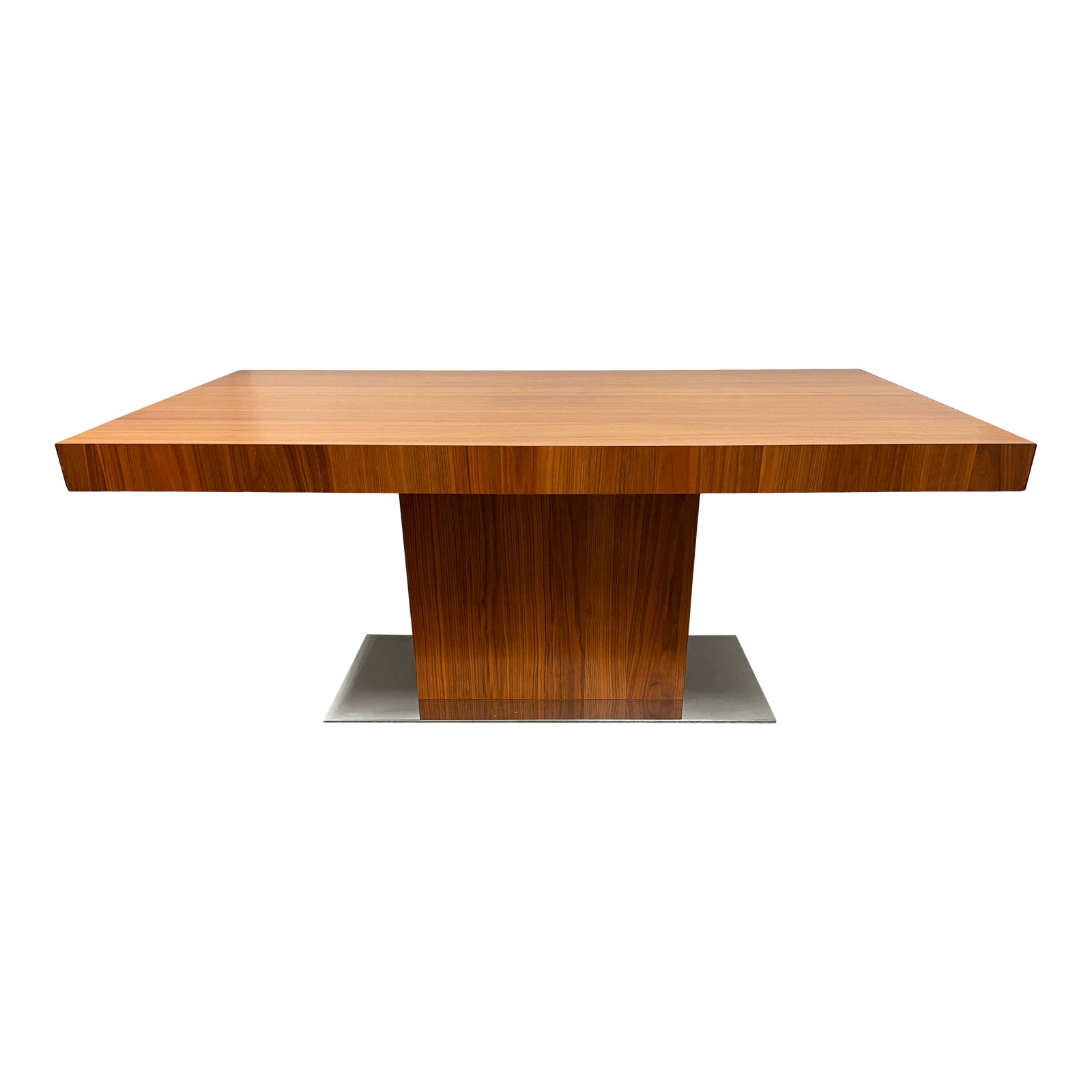 Design Plus Gallery presents a Park Extendable Table by Calligaris. An extra-long extending table with a wide wooden rectangular top that rests on a solid wooden pedestal base, with chrome-plated metal plate. Inside the top are located two removable side extension leaves, which can also be removed individually through a handy sliding mechanism, so you can comfortably accommodate up to 12 guests. Perfect for furnishing a spacious dining room with elegance. The table is discolored due to full sun exposure, the extensions are the original finish with minor wear on the corners. Minor wear from usage.