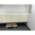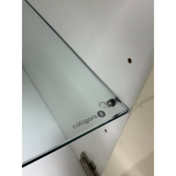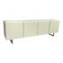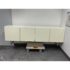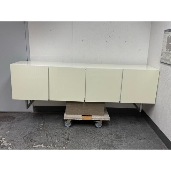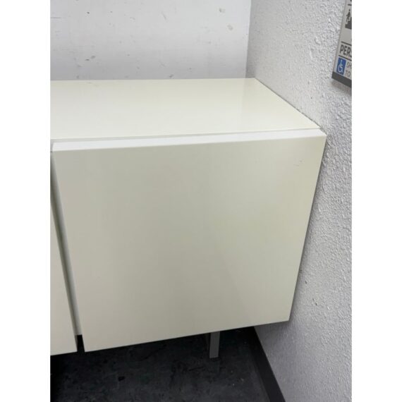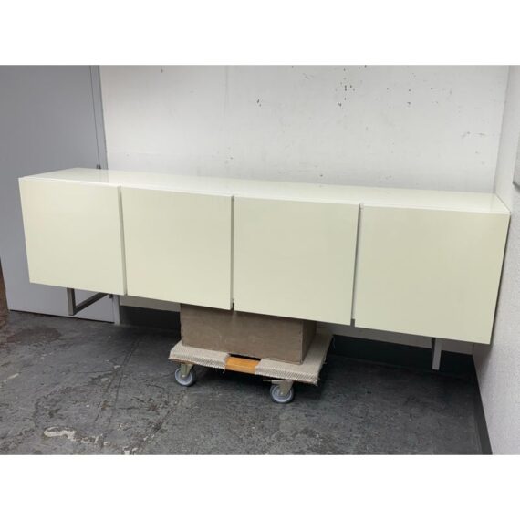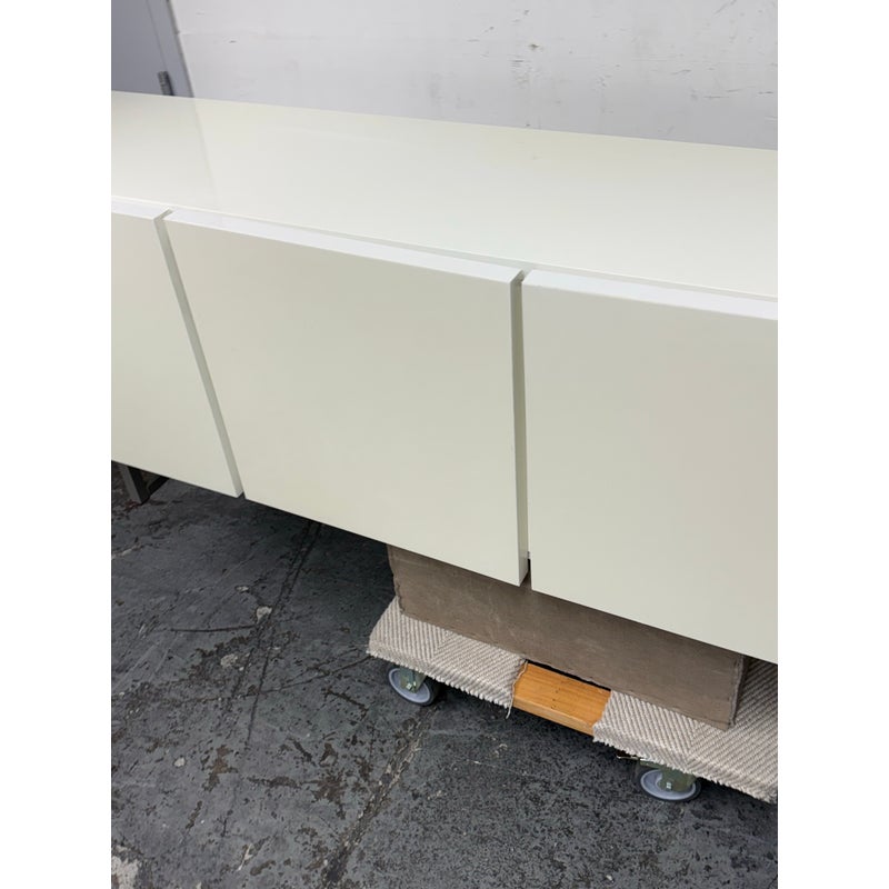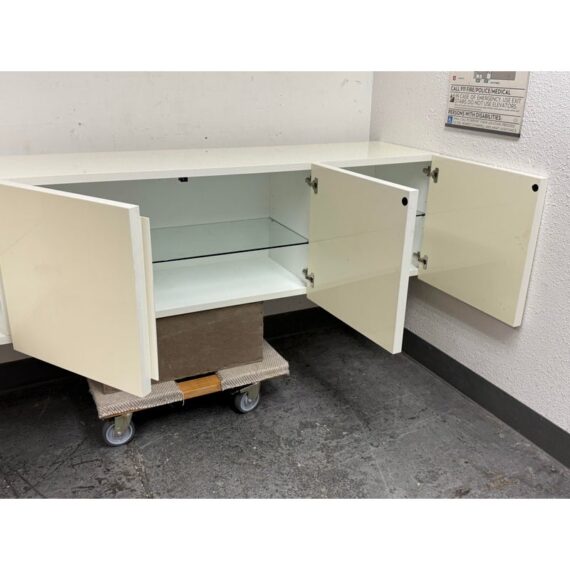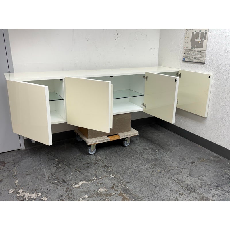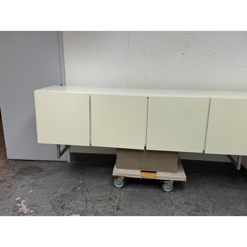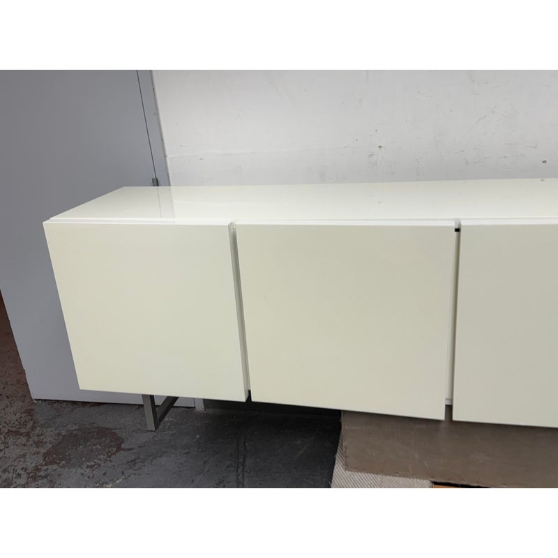 Design Plus Gallery presents the Seattle Sideboard from Calligaris. This modern buffet offers three compartments with four doors, and three height adjustable shelves. It features a glossy lacquered frame in white with a chromed metal base. The doors open with a push in the top corner, with the two quarter width doors on either side and a half width center cavity behind two cabinet doors. There are three inner transparent tempered glass shelves within the hidden cavity and they are height adjustable. This style of sideboard has been put out of production by the brand. One of the doors functionality is off and will need repair to be in the best condition. Visible surface wear is present but overall surface wear is good. Made in Italy.