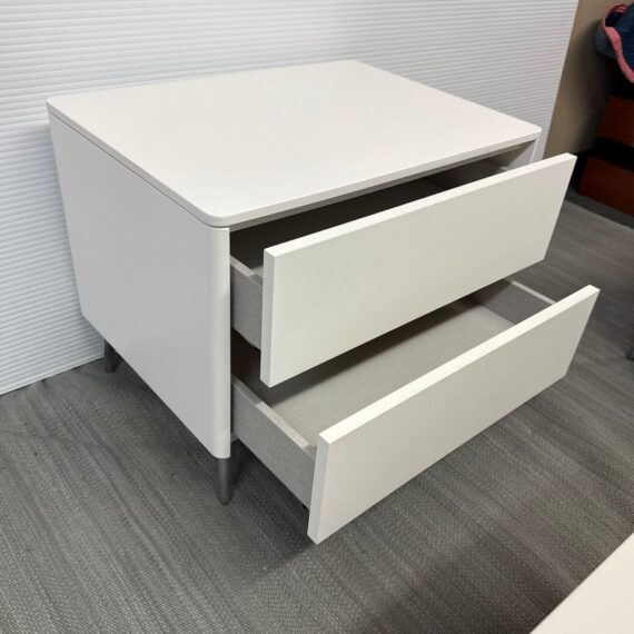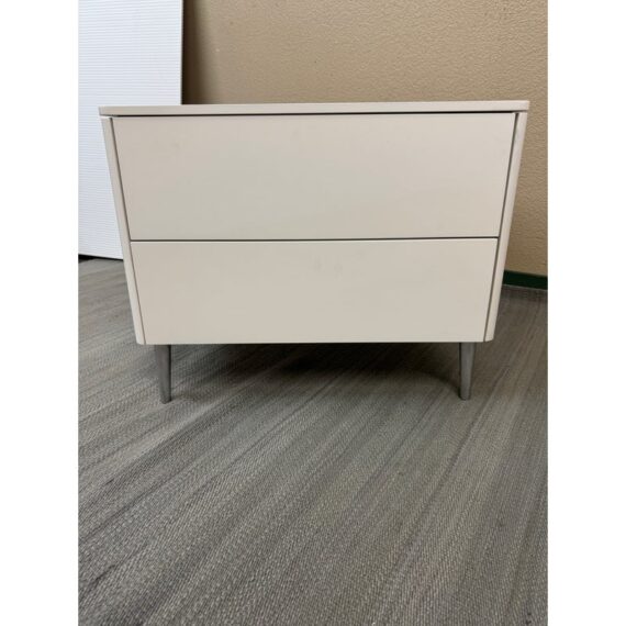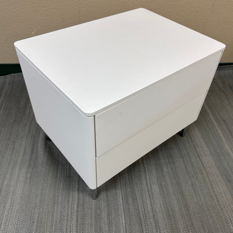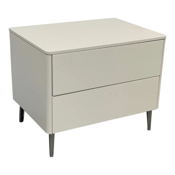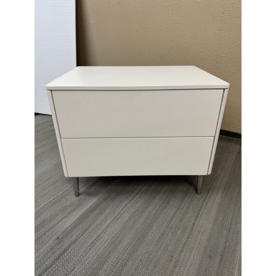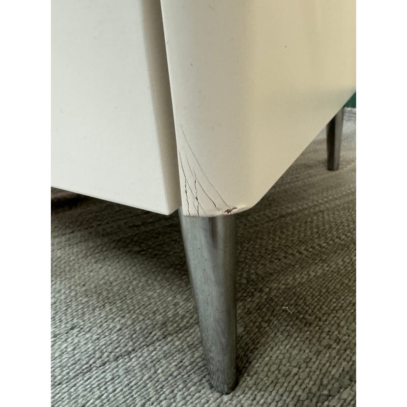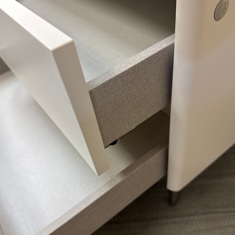 Design Plus Gallery presents a Spa Collection Nightstand from Calligaris. The nightstand was custom configured within the Spa Collections offerings. It has two push-to-open drawers with a textured gray liner. The entire outer shell has a white lacquer finish and is elevated on stainless steel legs. This style has been discontinued by the brand. Visible wear to the surface with a drawer that won’t open. Made in Italy.