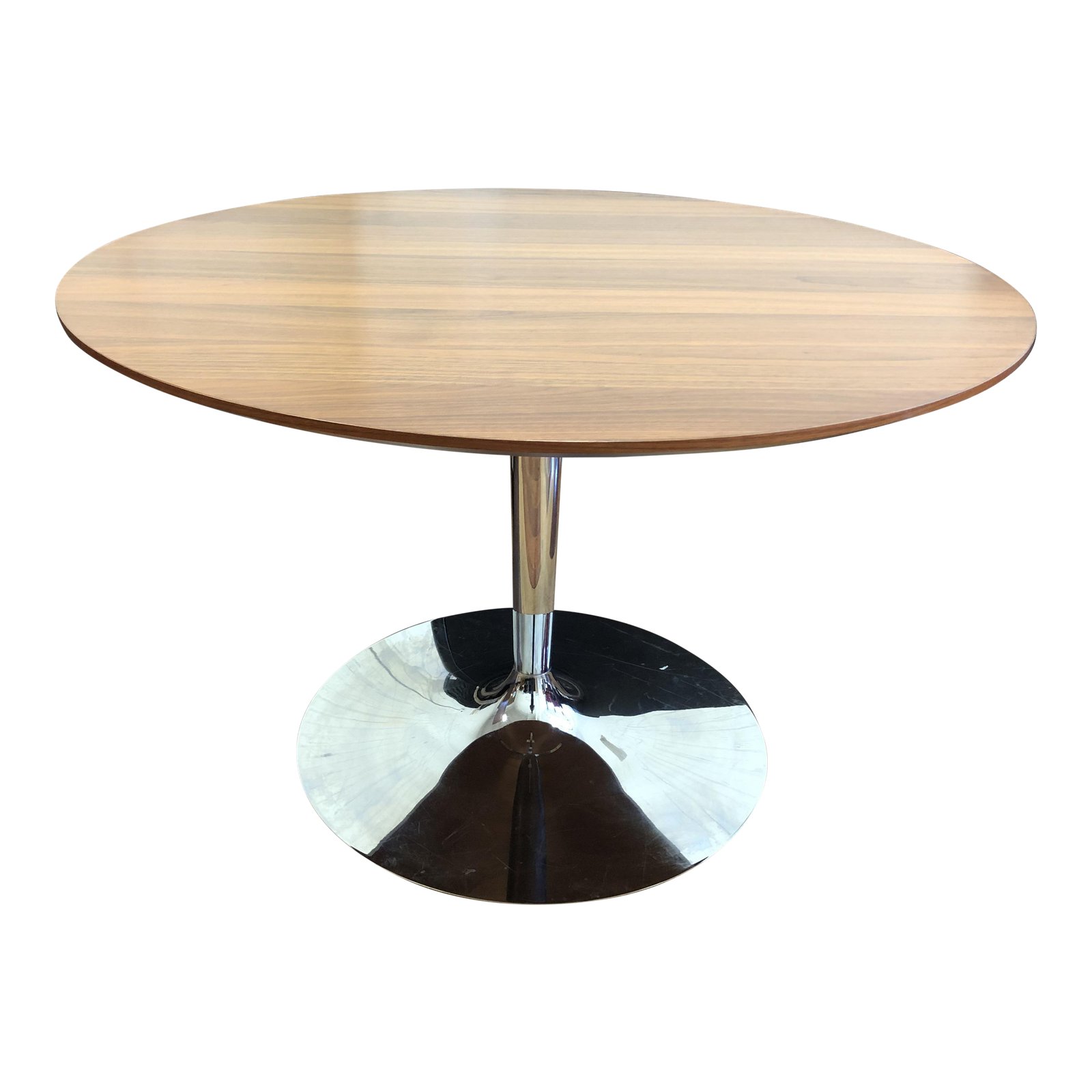 Design Plus Gallery presents a Round Pedestal Table by Calligaris Spa. A modern table that nods to mid-century design. Features a round walnut top that sits on a chrome-plated tulip style base. minor wear. Label markings underneath. Made in Italy.