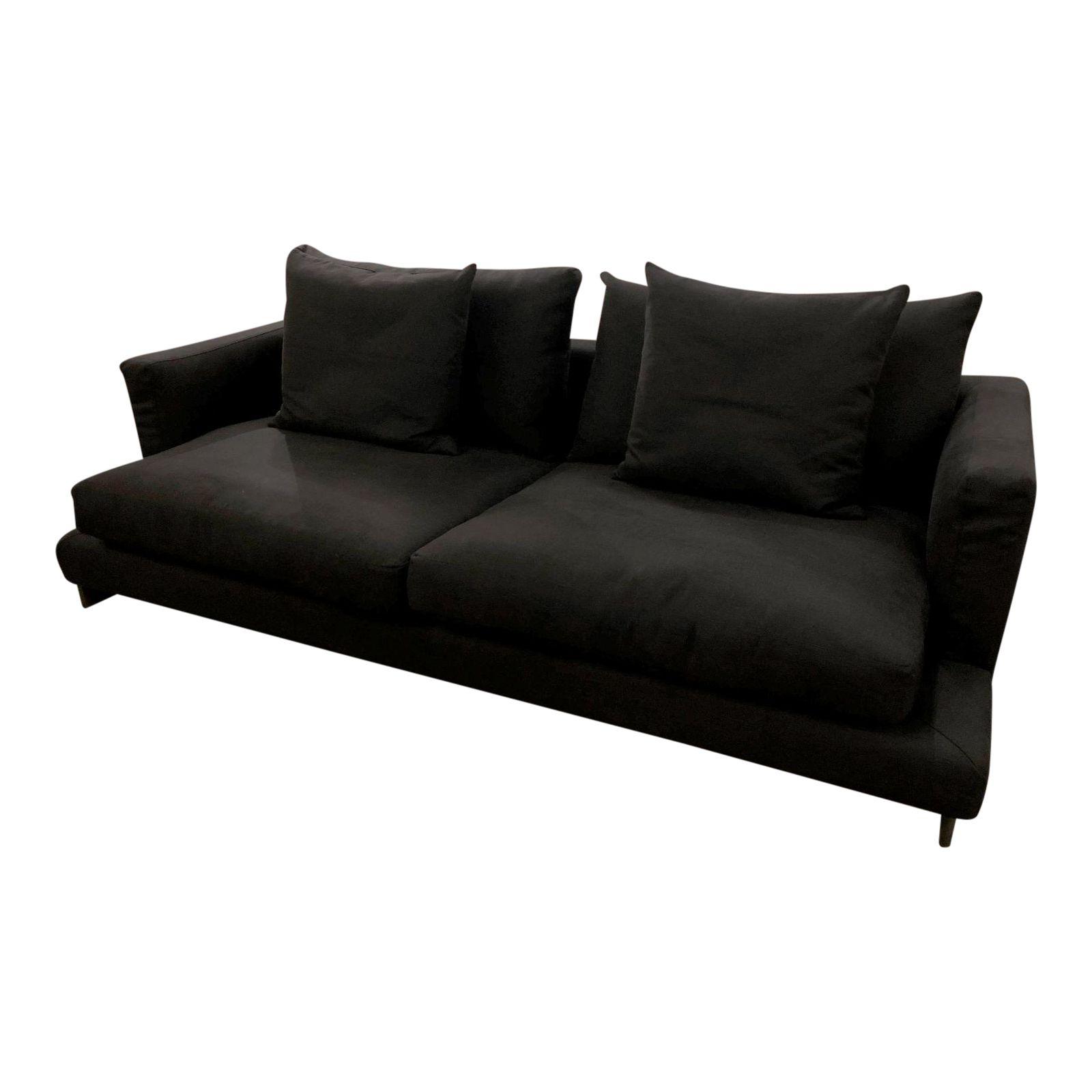 Design Plus Gallery has a Camerich Lazy Time small sofa. The sofa is part of the Alchemy Collection. Theis extremely comfortable sofa is upholstered in Black Linen which gives it a very relaxed and inviting sensibility. The seat cushion as well as the back pillows are down wrapped which makes the sofa almost irresistible. It sits on sleek Steele legs.