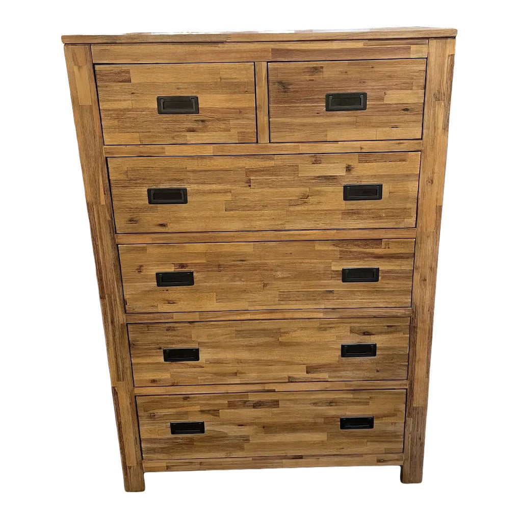 Design Plus Gallery presents a Campaign Style Dresser. Clean silhouette creates a timeless style that sets the tone for a bedroom. Six roomy drawers are wrapped in microplank wood solids and veneers and finished with antiqued metal pulls.