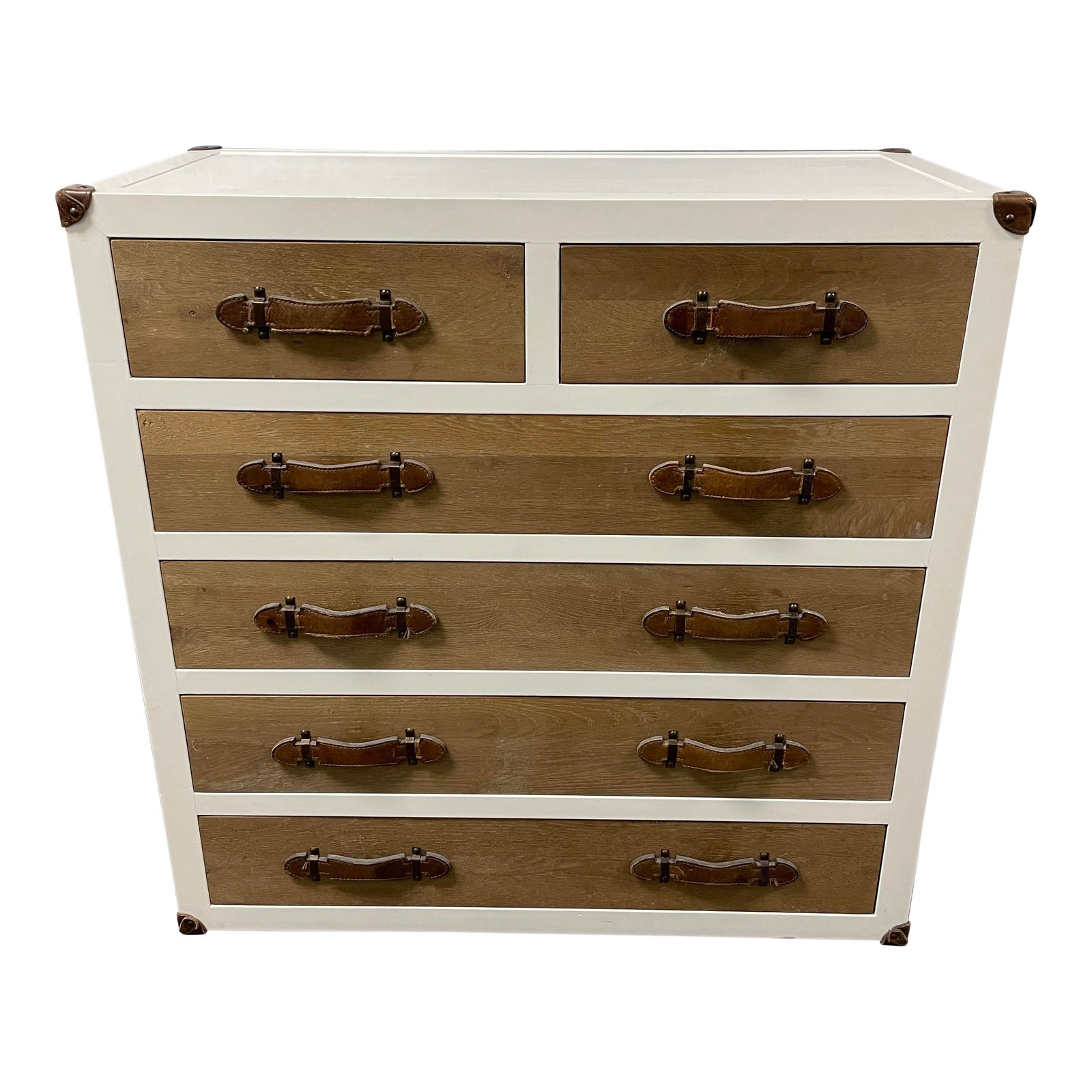 Design Plus Gallery presents a Campaign Style Chest of Drawers. Frame work is a crisp white lacquer and contrasts beautifully with the oak panelling on the drawer faces and leather straps for the pulls. Interior of drawers are painted a crisp white as well. Leather accents the corners, hardware and sides of unit in the fashion of a trunk. Minor wear.