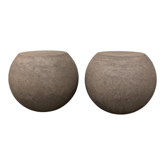 Design Plus Gallery presents a Pair of Cappellini Bong Low Side Tables. Simple and rustic with an organic modern touch. Sphere stone like form has the appearance of a heavy boulder. Fabrication is made with a lightweight and hollow fiberglass. Top is flattened with a round shape for using bed side or as occasional surface. Can also be used outdoors. Finished with a rustic lave stone texture. Made in Italy.