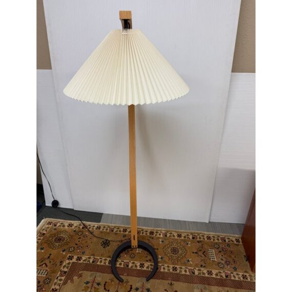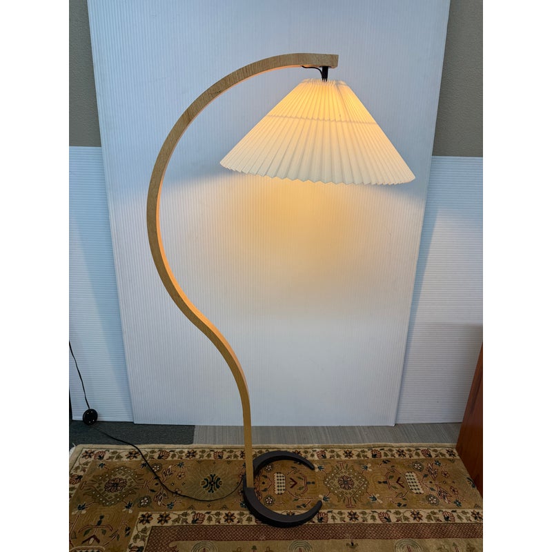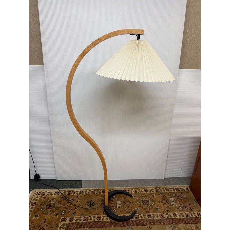 Design Plus Galley presents a Bentwood Floor Lamp in the style of Caprani. This style lighting was first created by the Danish lighting designer in the 1970s and rapidly became Caprani’s flagship product. It has a playfully curving, swan-necked floor lamp that both captures the Scandinavian design language of the 1970s and transcends it, becoming one of those rare pieces that can slip effortlessly into any space, of any style. This thoughtfully made reproduction of the iconic piece is made with the use of zebra wood veneer on the arching stem and the black casted metal. It shows some visible wear for its regular usage but overall in good condition.