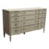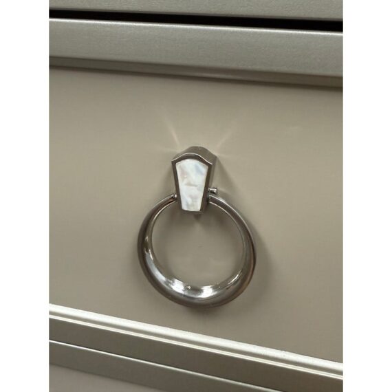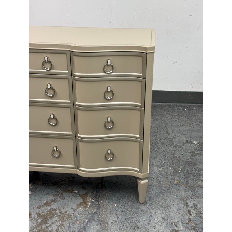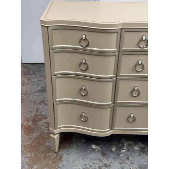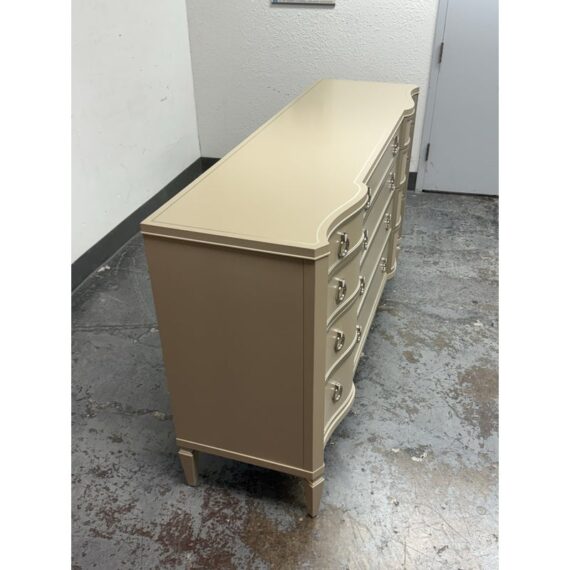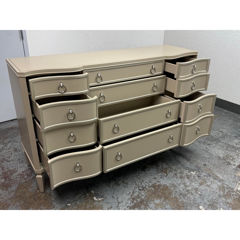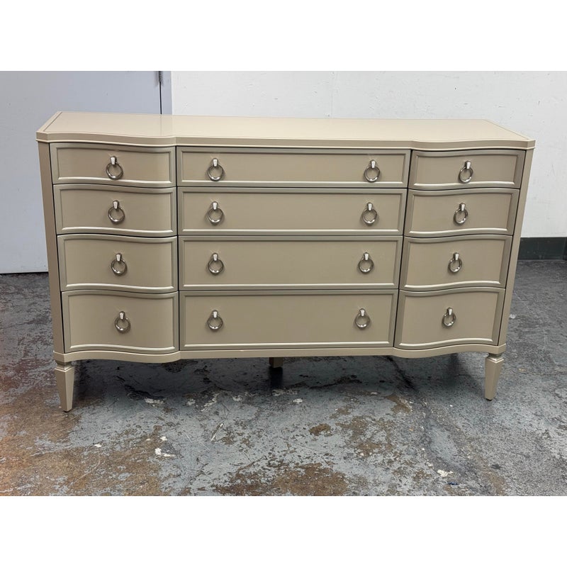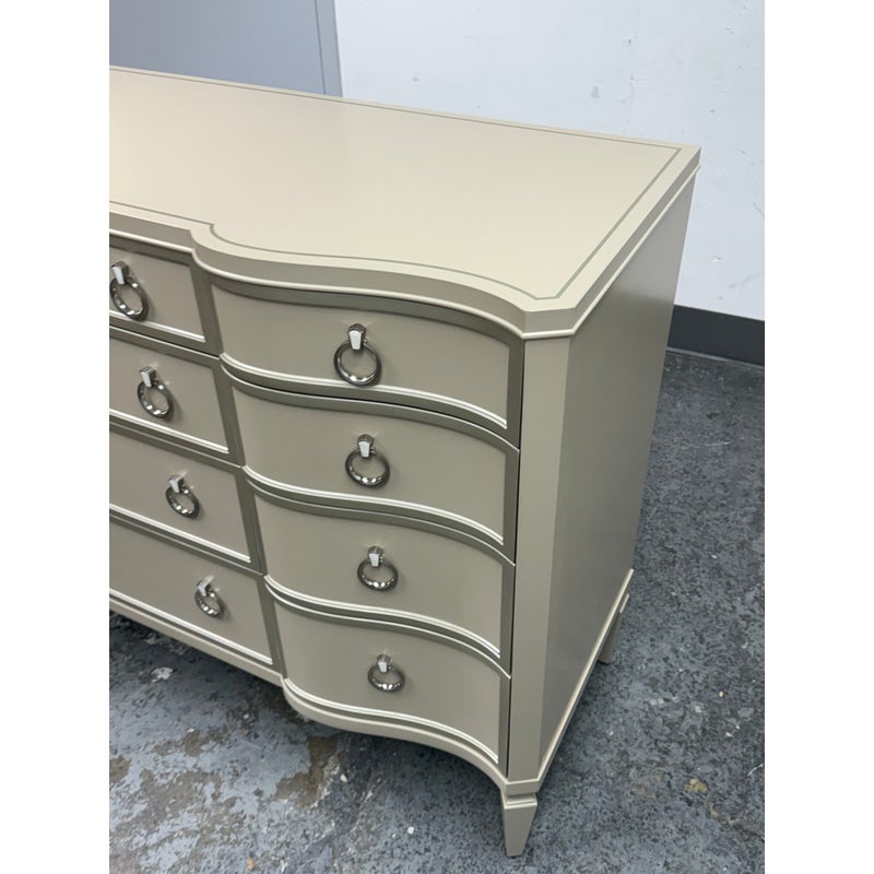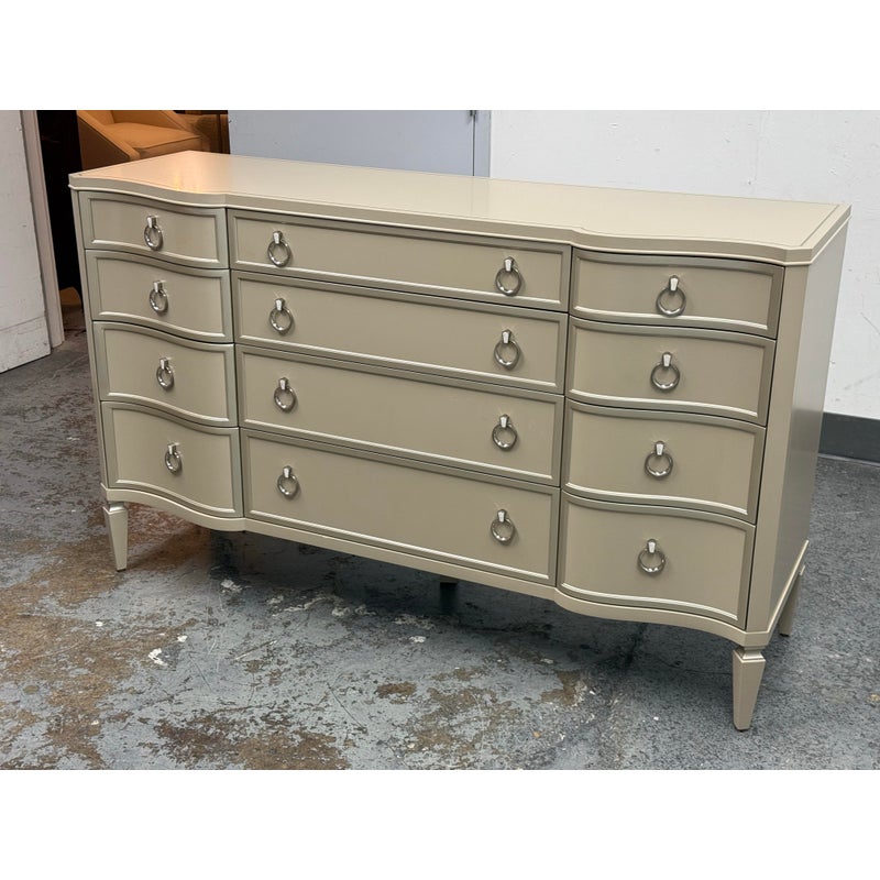 Design Plus Gallery presetns the Pull It All Together Dresser from Caracole. The dresser has an exquisite silkscreen design painted on its shaped top. Twelve spacious soft-close drawers make it easy to keep everything in place, while its classic design features a luxurious radiant pearl finish with sparkling argent accents on select moldings. The overall effect is one of timeless luxury and everyday elegance. Nickel finish hardware is the perfect complement to the pearl finish and are easy to manage with their ring pulls. The dresser is in good condition for its use + age with minimal signs of surface wear.