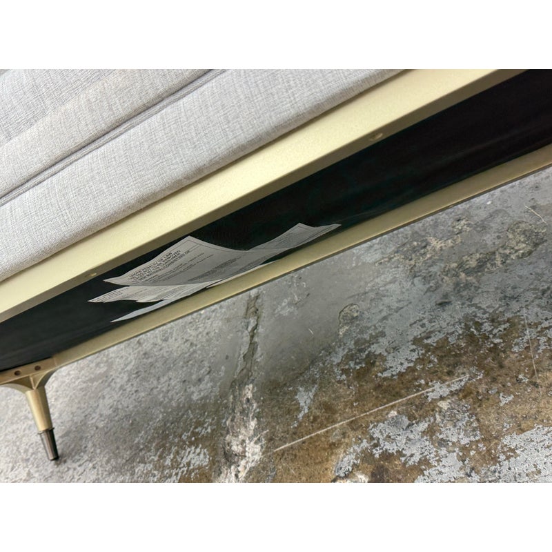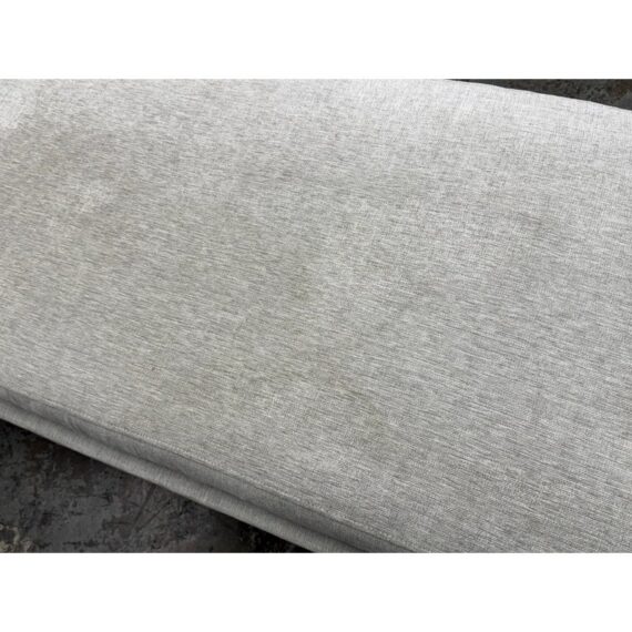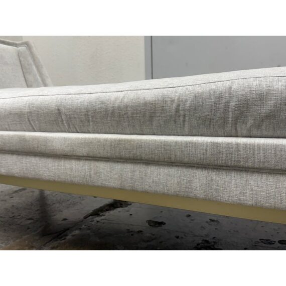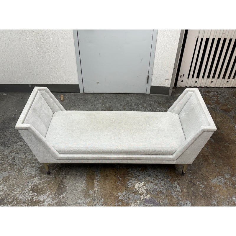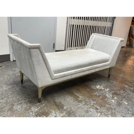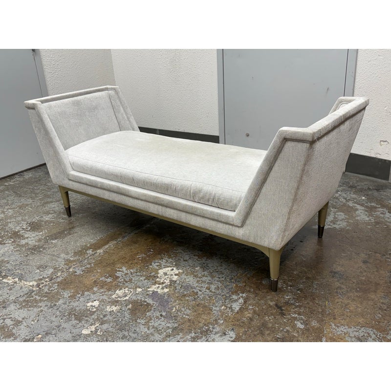 Design Plus Gallery presents the End-to-End Chaise from Caracole. This upholstered chaise pairs a long rectangular seat with angular end panels that rise in a tailored silhouette. Neutral woven upholstery is set over tapered legs with metal capped feet, and piped trim outlines the frame and cushion with clear definition. The overall profile blends linear structure with soft texture for a polished look. It is in good condition with visible soil on fabric and minimal wear from usage.